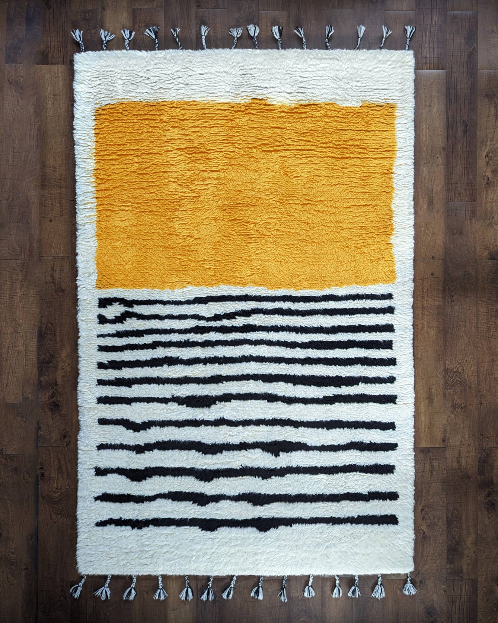 This isn’t just a rug; it’s the soul of the room. The ultra-thick wool shag texture invites you to lounge on the floor, making it a favorite spot for kids, pets, & adults alike. We love how the marigold section brings instant warmth to a space, while the unexpected mix of black and white stripes and adds a graphic, modern edge that keeps the look fresh.