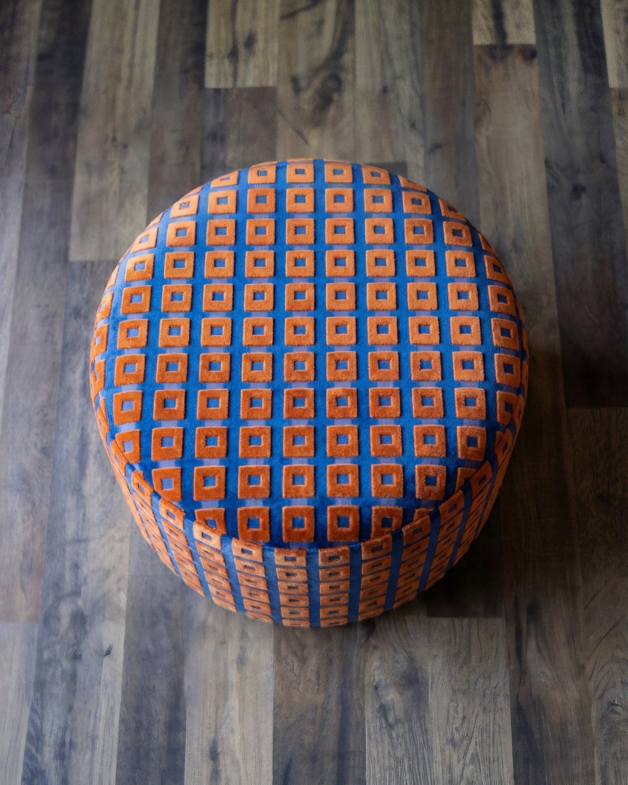 Expertly upholstered in sumptuous French velvet, known for its deep pile and lustrous sheen, this ottoman features a sophisticated geometric grid pattern. The rich interplay of warm, burnished copper squares set against a deep indigo framework creates a sense of depth and luxury that catches the light beautifully.