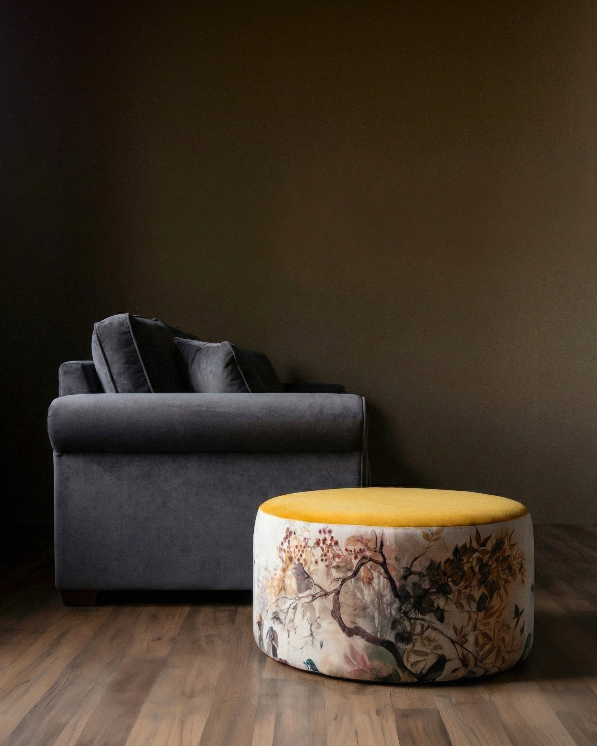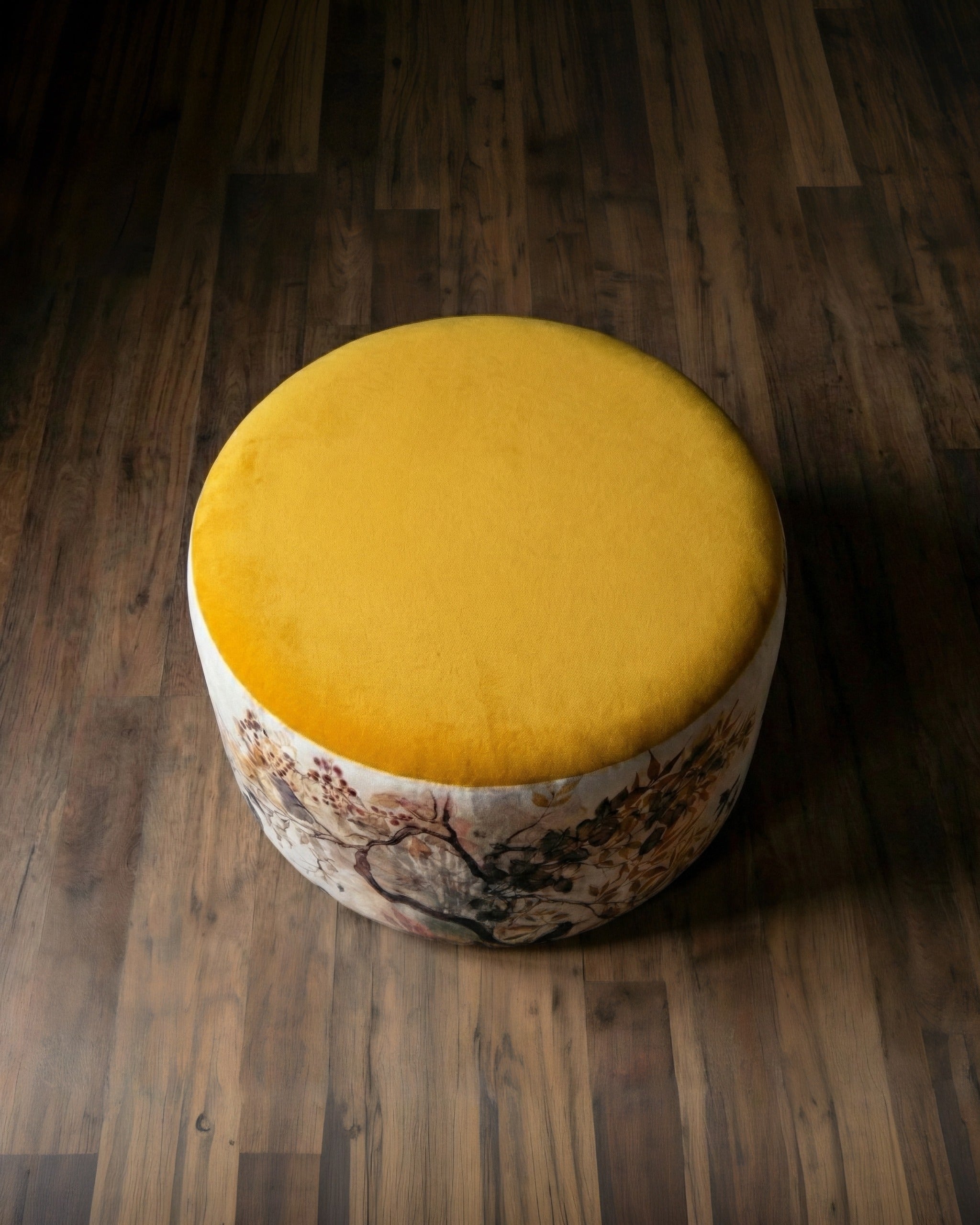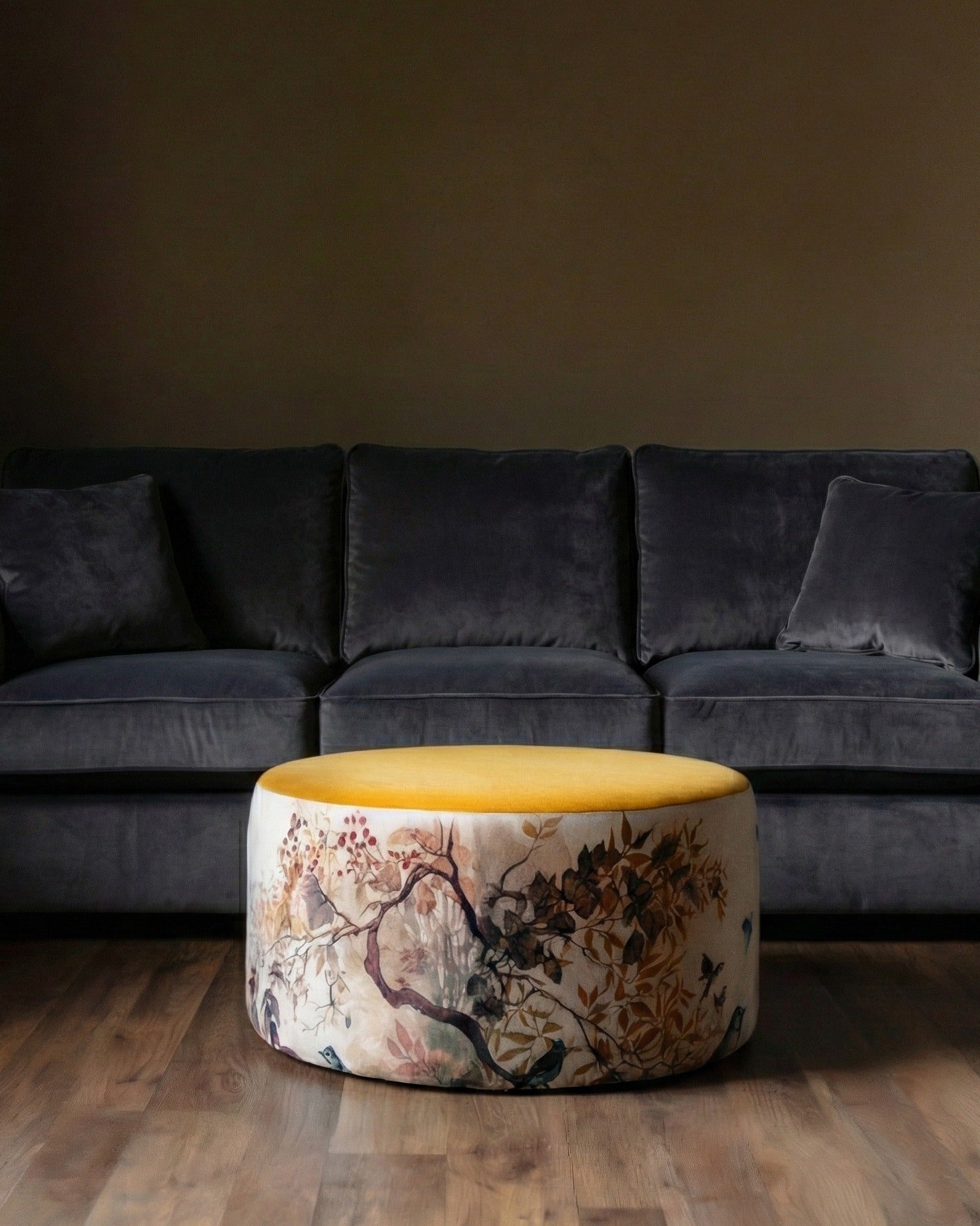 Introduce a touch of nature-inspired luxury to your living space with this exquisite round ottoman. The top is upholstered in a plush, sun-drenched yellow velvet, offering a vibrant pop of color and an incredibly soft, inviting texture. The sides feature a richly detailed botanical print, showcasing painterly branches, autumn leaves, berries, and perched birds in warm, earthy tones. This artisan-crafted stool serves as a stunning focal point, perfect as a chic footrest, a unique coffee table alternative, or elegant extra seating. Its versatile design and premium materials make it a sophisticated addition to any room.