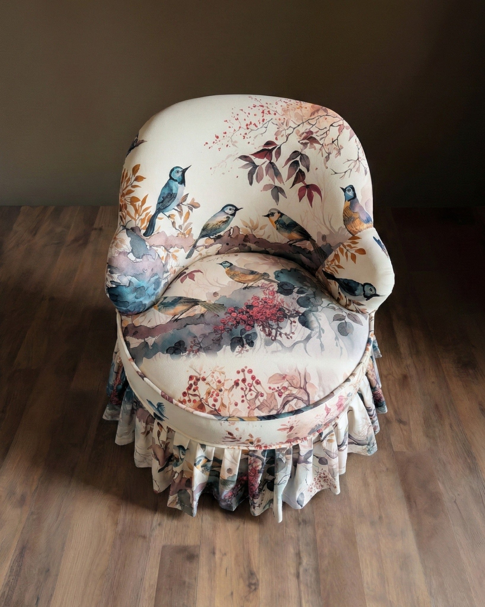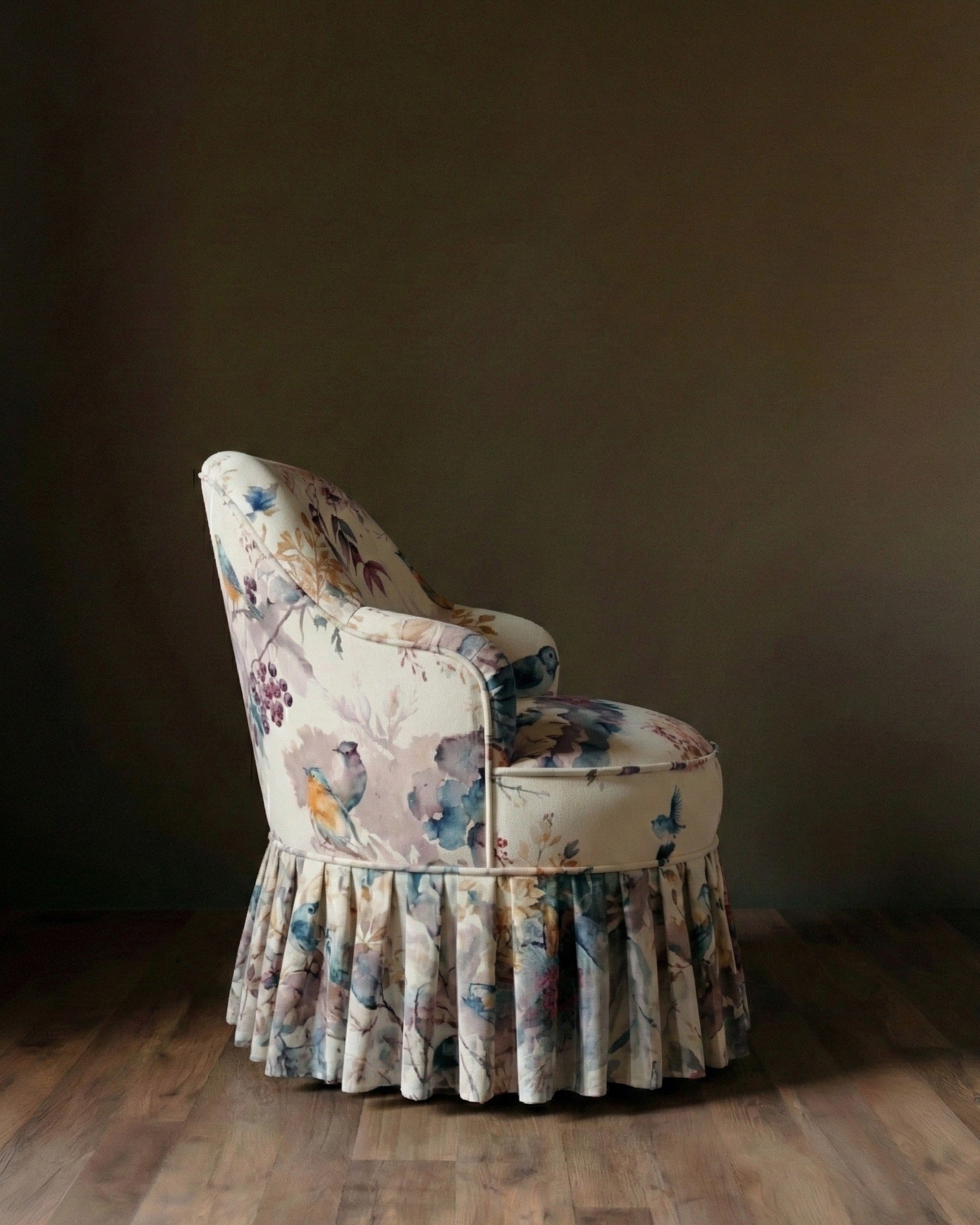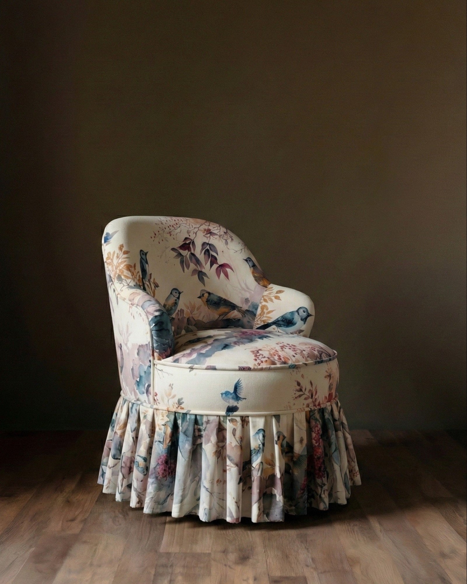 Introducing the Byrd Ruffle Velvet Chair, a truly enchanting piece that brings whimsical elegance and luxurious comfort to any room. Adorned with a delightful bird and botanical print, the Byrd sofa features plush velvet upholstery that is soft to the touch, ensuring a cozy & inviting experience. The vibrant pattern, showcasing a charming array of birds nestled amongst lush foliage and blossoms, creates a captivating focal point that will spark joy and conversation. A unique ruffled skirt adds a playful yet sophisticated detail, making the Florence sofa a perfect accent for a cozy reading nook, a sunlit conservatory, or a creatively styled living room.