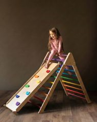 This jumbo climbing triangle paired with a reversible rock ramp fosters imaginative, cooperative play for children in pairs or groups. Its minimalist design invites endless creative possibilities, transforming any space into an adventure playground. When not in use, the set adds a warm, elegant touch to your room. Each piece is meticulously handcrafted from FSC/PEFC-certified sustainable wood, complies with ASTM F963-17 safety standards, and is finished with water-based protective lacquer and paints.
