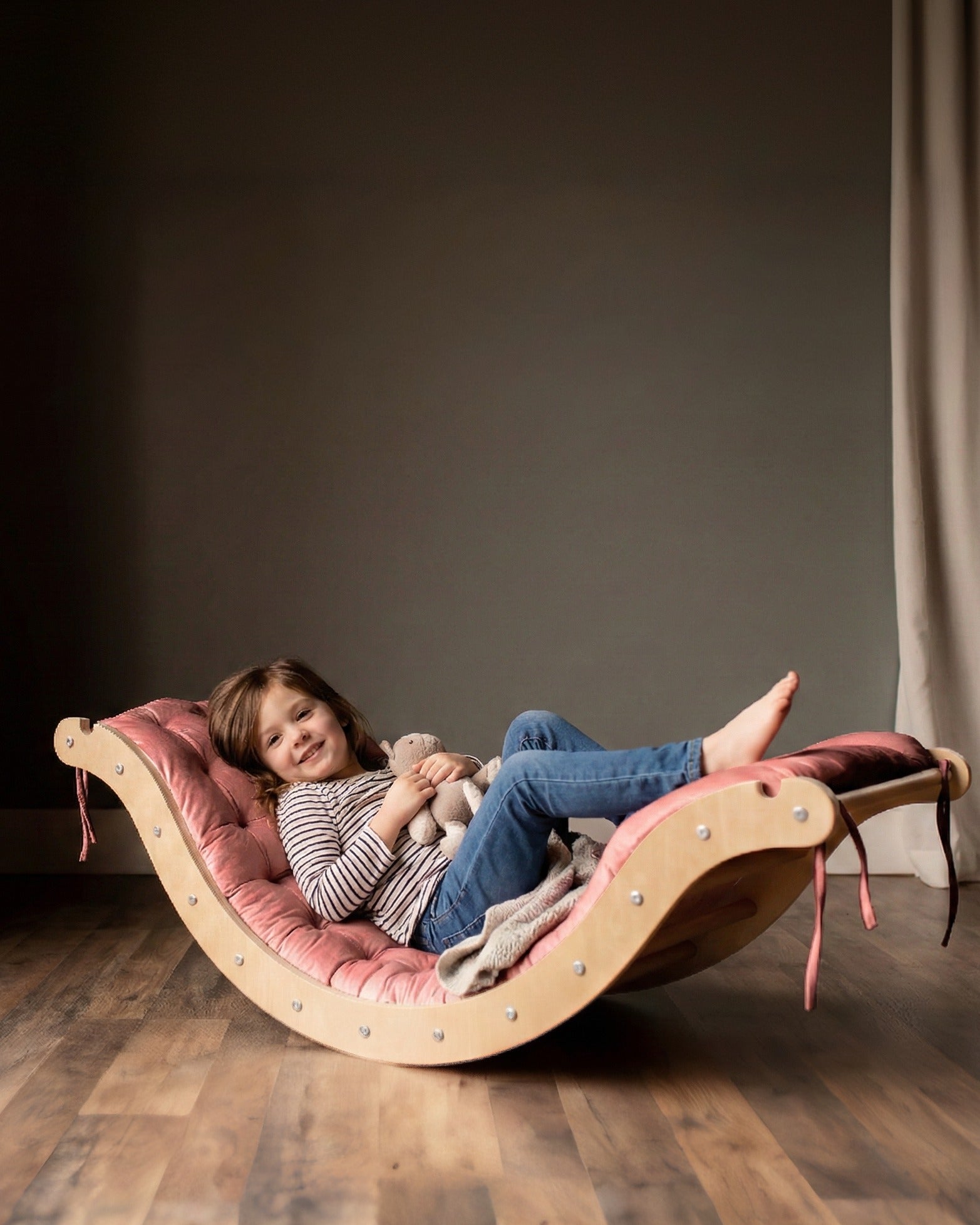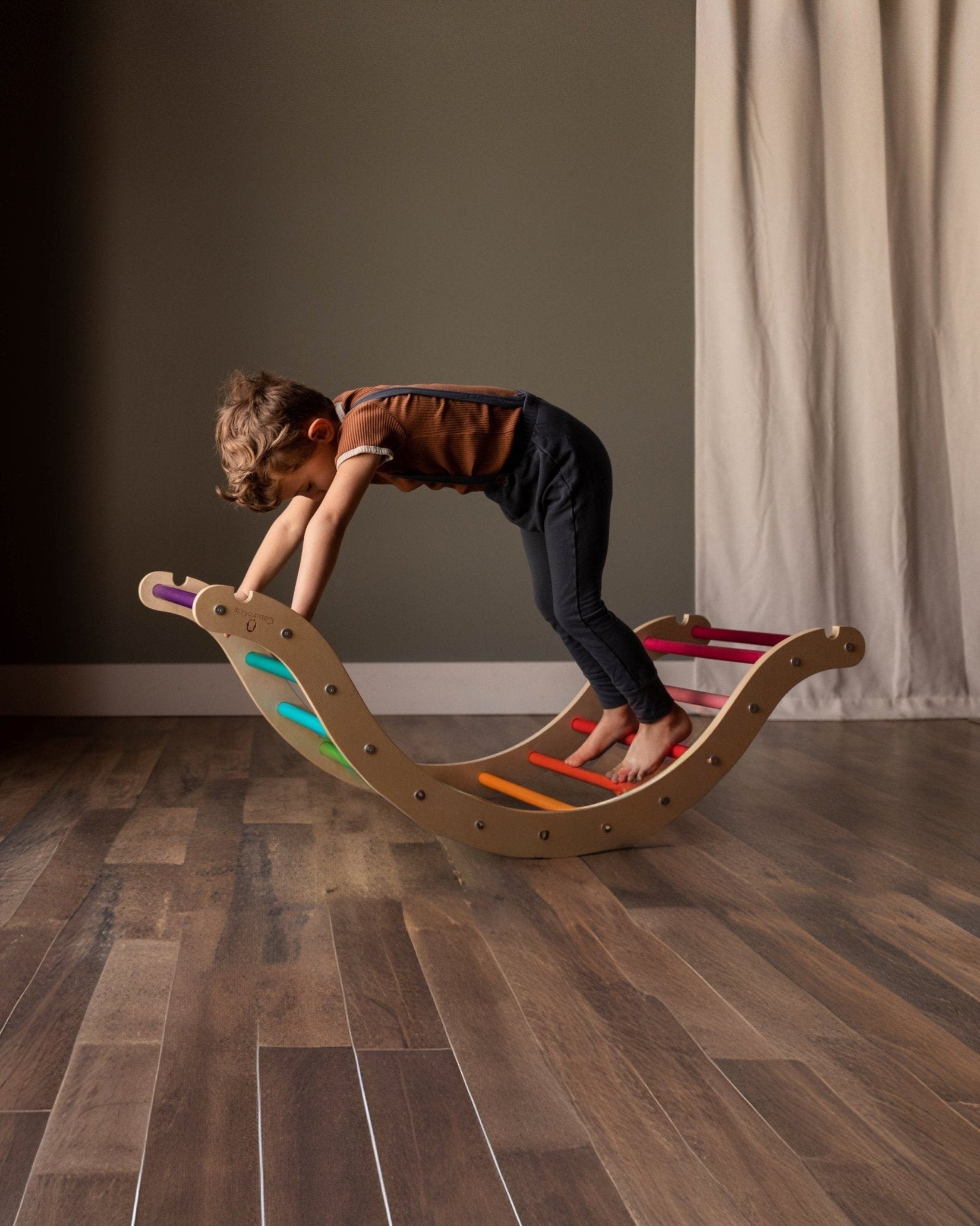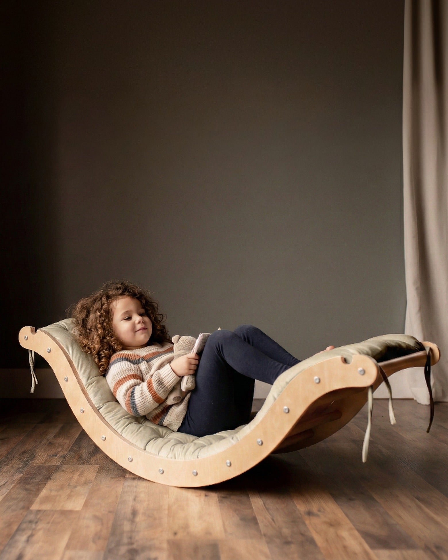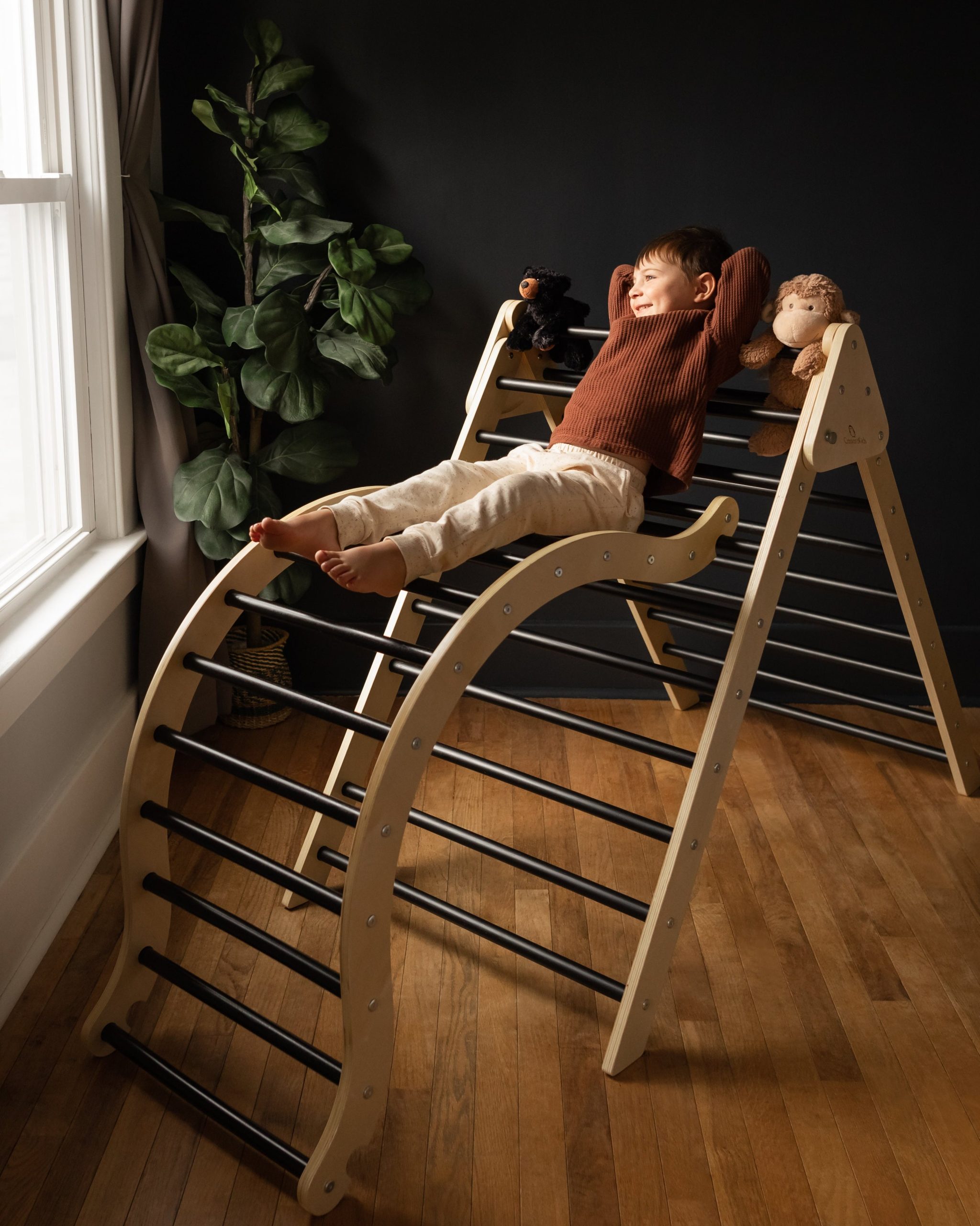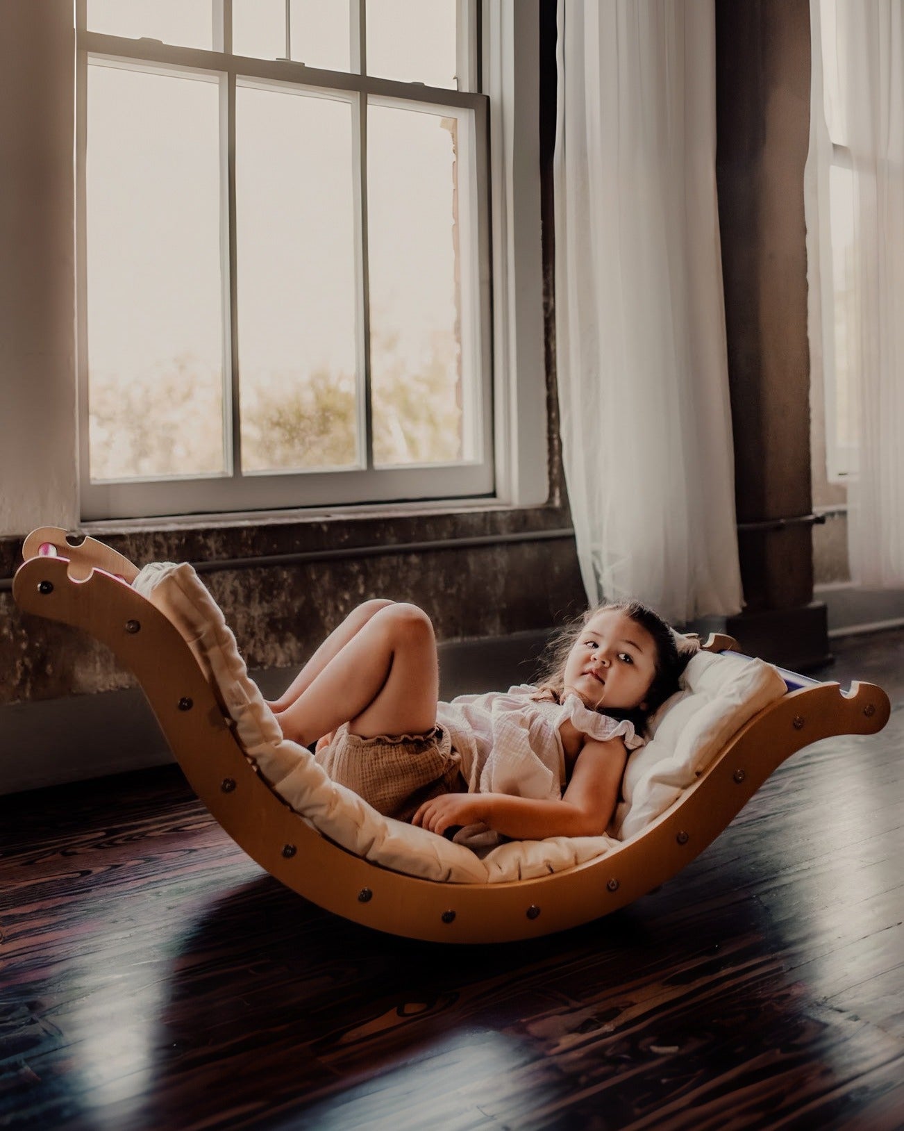Experience the Jumbo Waldorf Arch, designed for both rocking and climbing fun. Use it solo for a gentle rocking motion, flip it to form a climbable arch, or connect it to our Cubes, Towers, or Climbing Triangles to enhance play possibilities. Adding a pillow creates a cozy spot for relaxing rocking.  This adaptable piece invites endless imaginative play. Simply place it down and watch creativity unfold.