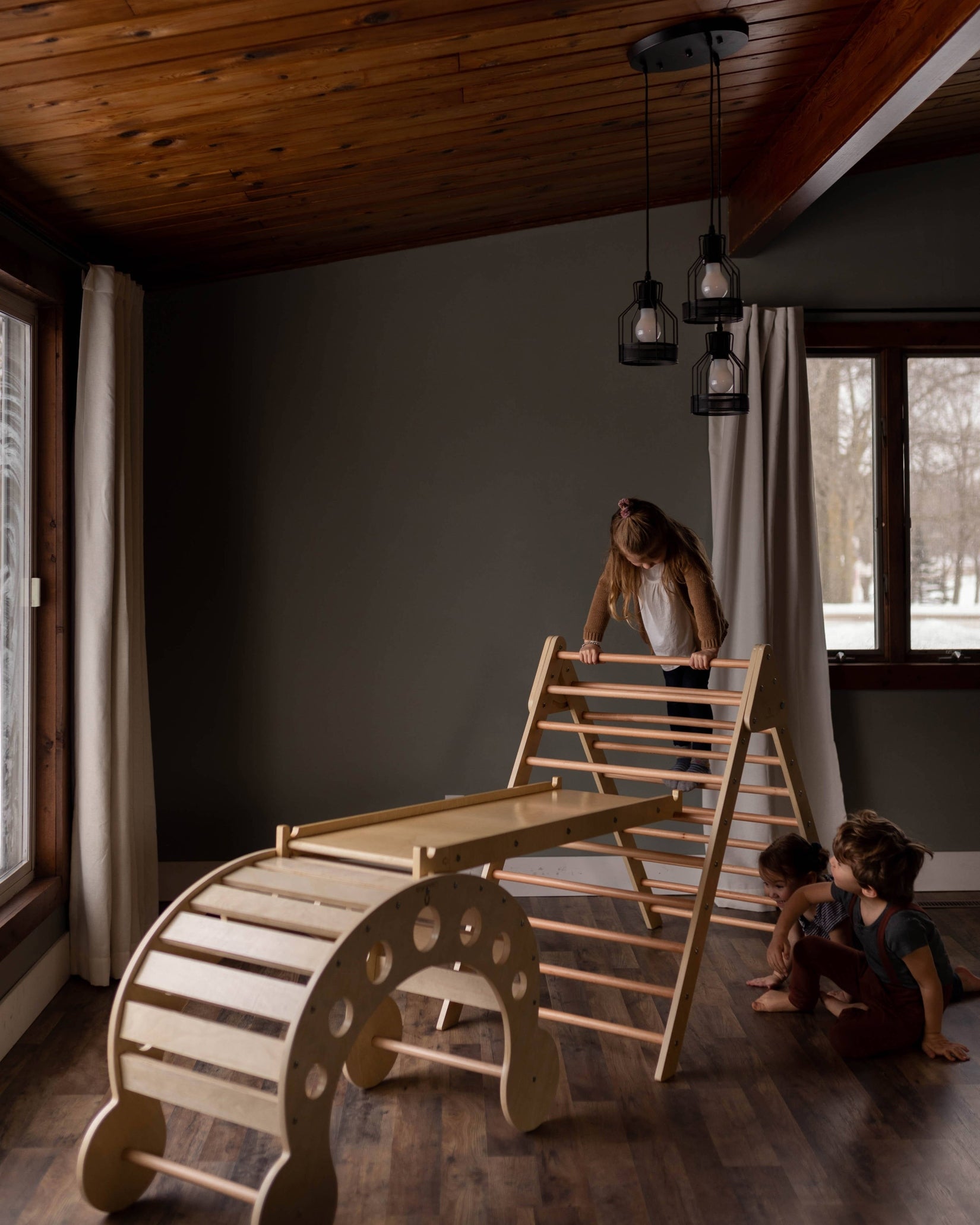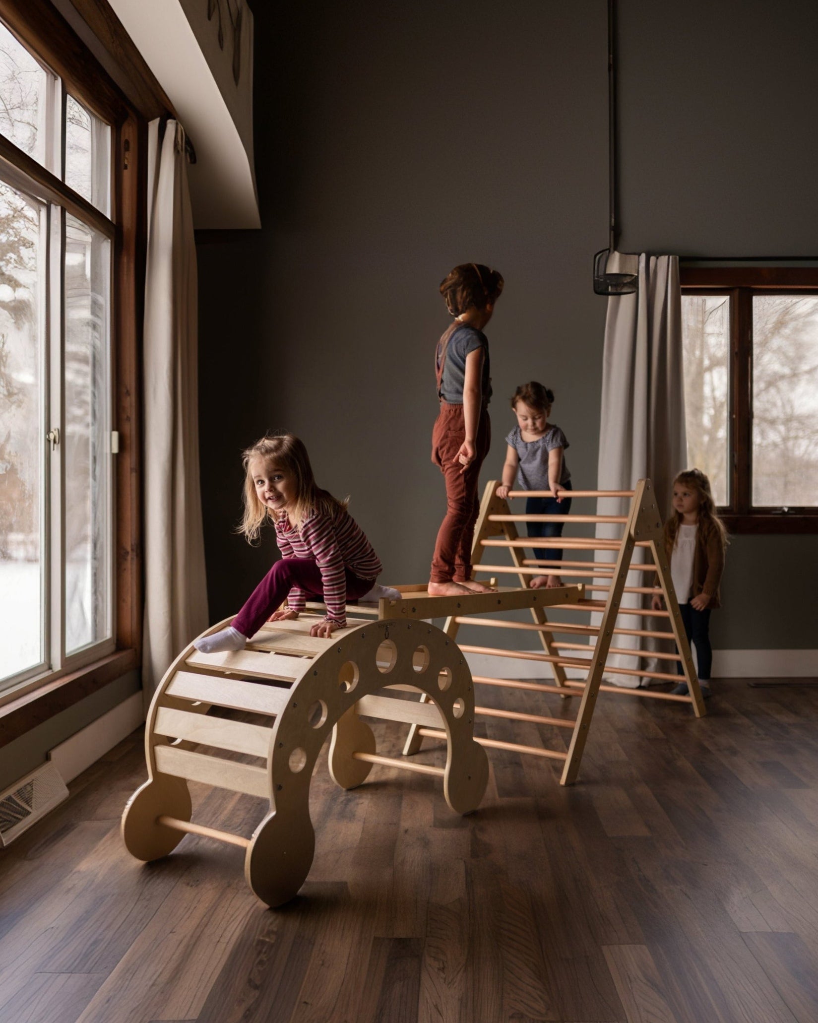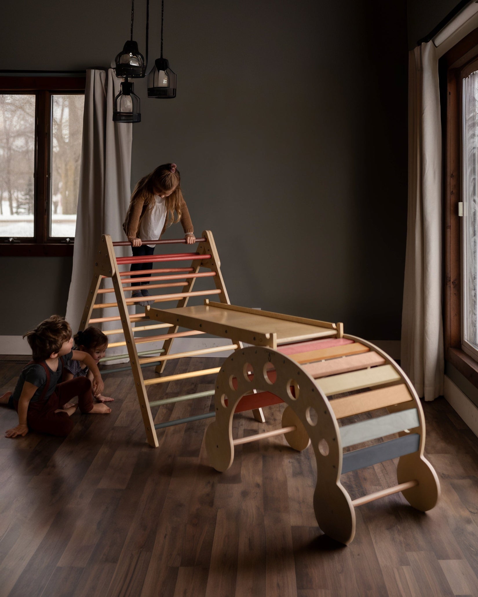 The Cassarokids Jumbo Waldorf Climbing Playset is the ultimate indoor activity center for active toddlers. This comprehensive 3-piece set includes a jumbo foldable climbing triangle, a jumbo Waldorf rocker, and a reversible rock climbing ramp that doubles as a smooth slide. Hand-crafted from 100% sustainable Birch and Beech wood, each piece can be used individually or connected to create custom obstacle courses.