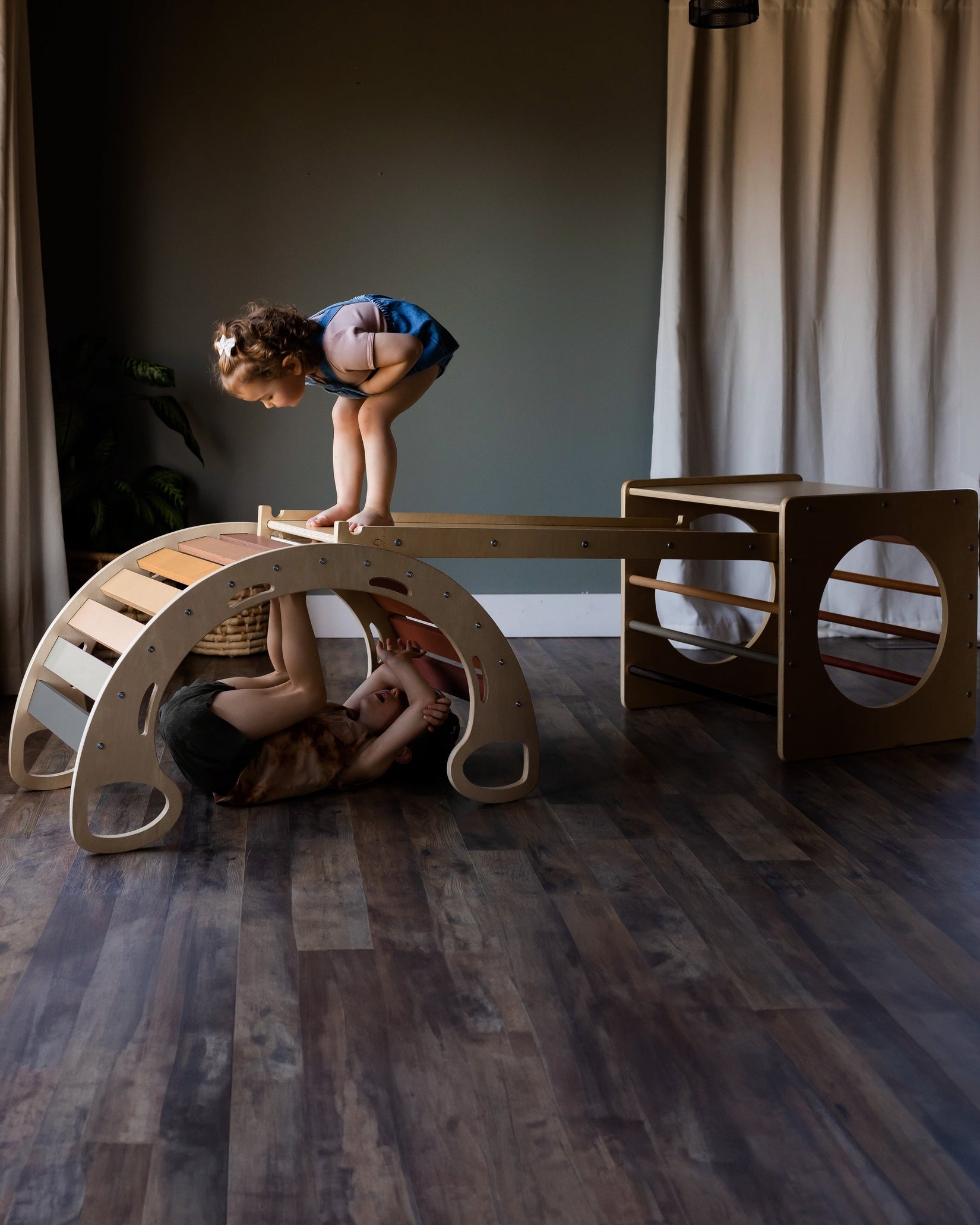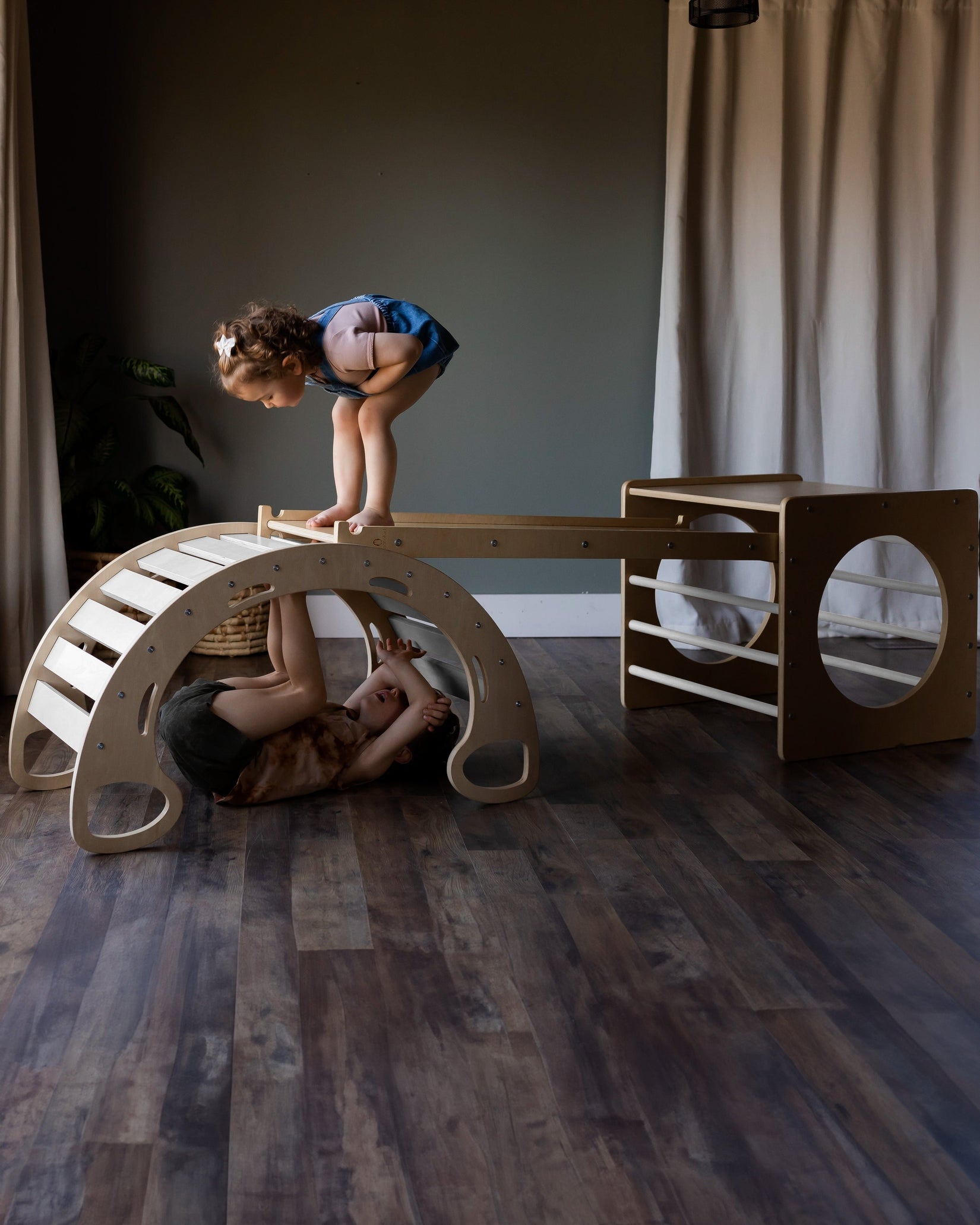Rainy or chilly days need not mean increased screen time. Invite imaginative and active play indoors with this elegant playset designed for toddlers and preschoolers. Featuring a jumbo Waldorf rocker, reversible slide, and a spacious play cube, it offers endless opportunities for climbing, sliding, and balancing within the safety of your home. Connect the slide between the rocker and cube to form an exciting bridge, or use the pieces separately for varied play experiences. This refined set promises hours of engaging fun, day after day.