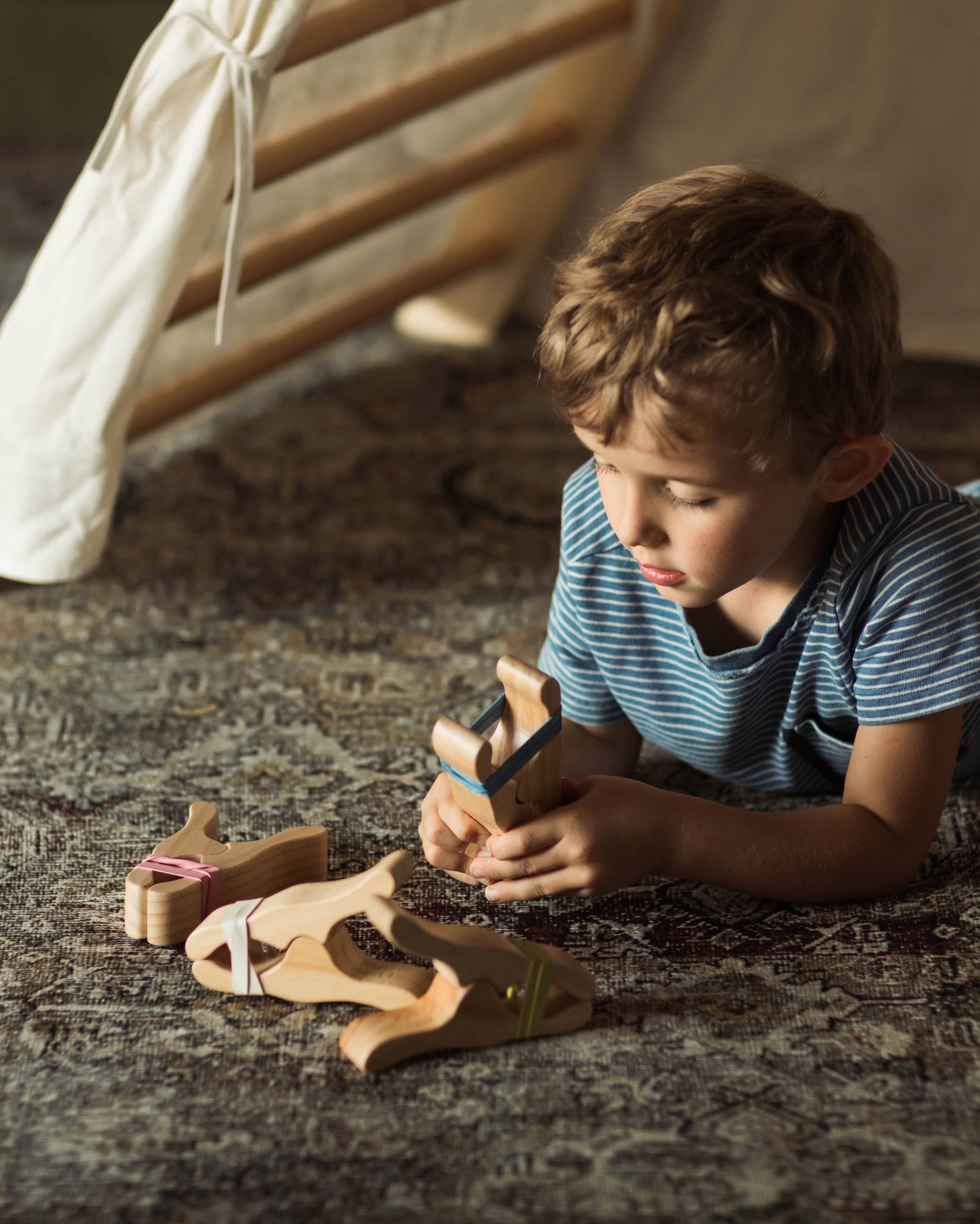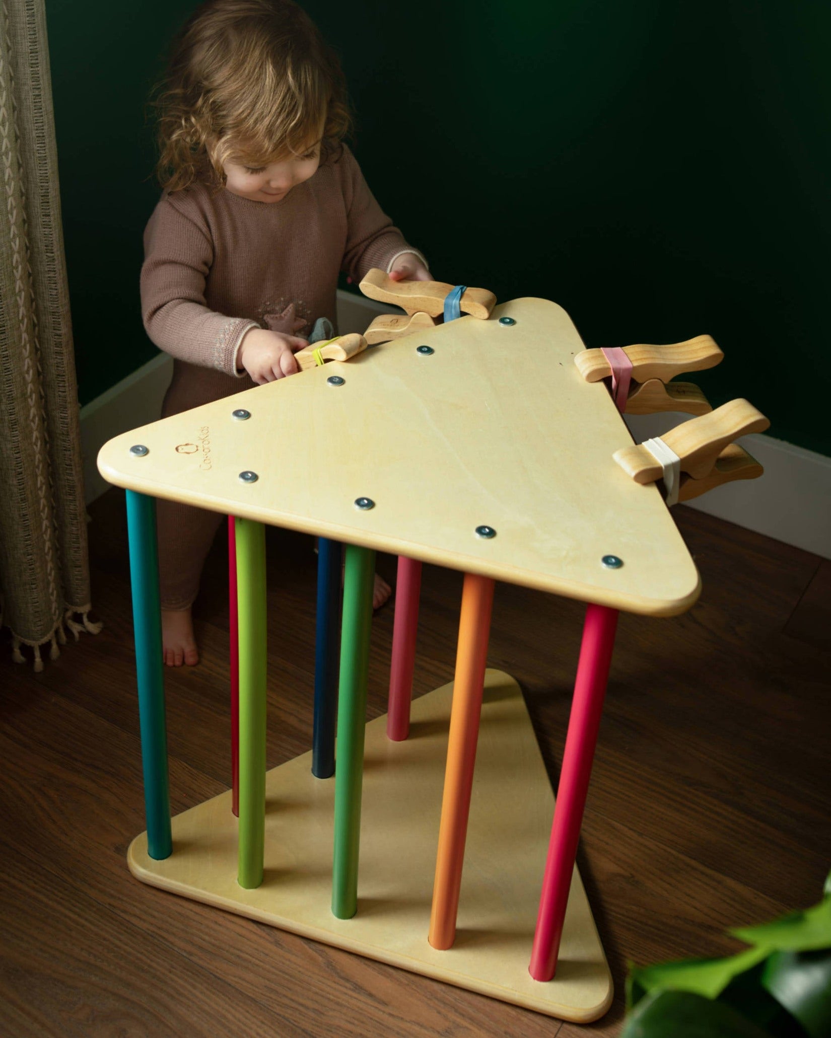 Crafted from natural oak wood, these clips offer a lightweight and smooth feel while maintaining robust durability for energetic play. Ideal for constructing blanket forts, securing fabrics on play stands, or imaginative activities such as dinosaur and robot hands, each set contains four clips with multicolored rubber bands plus eight extra bands for extended creativity.