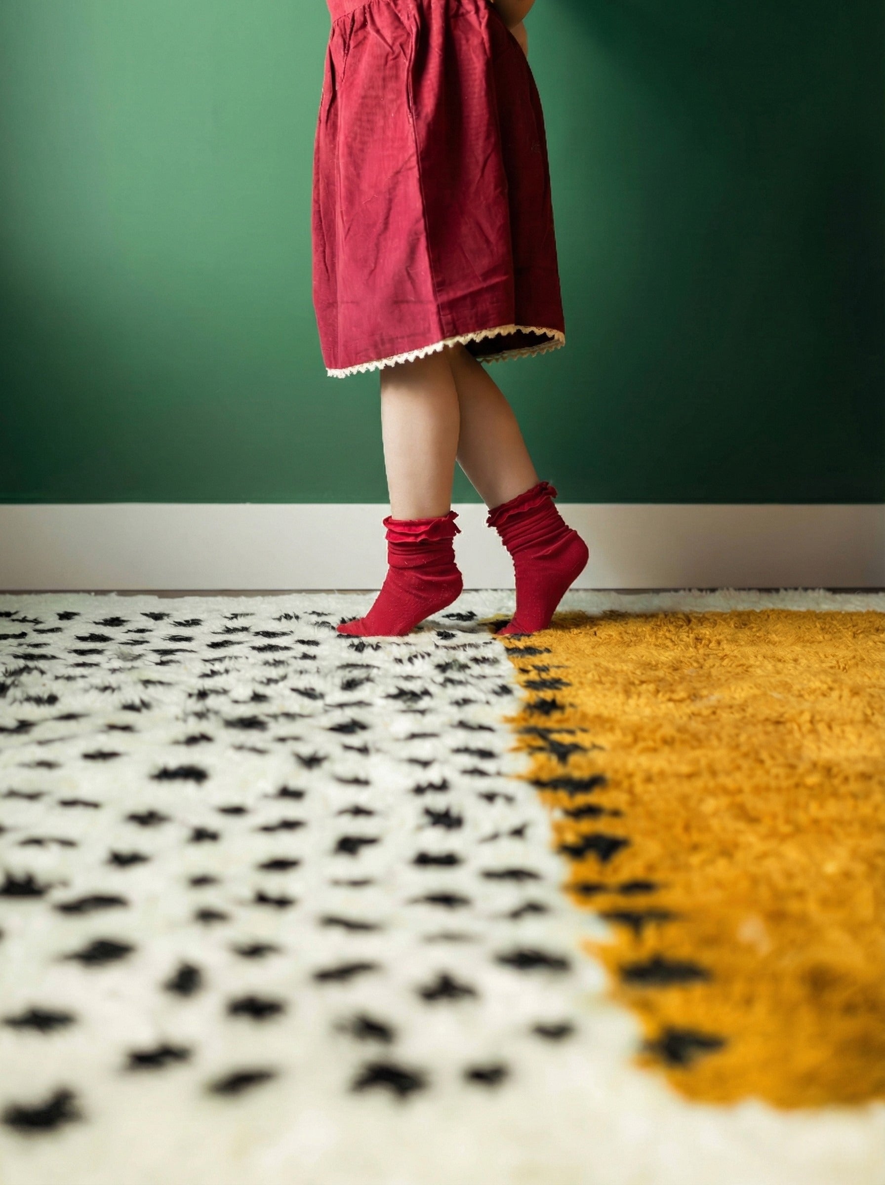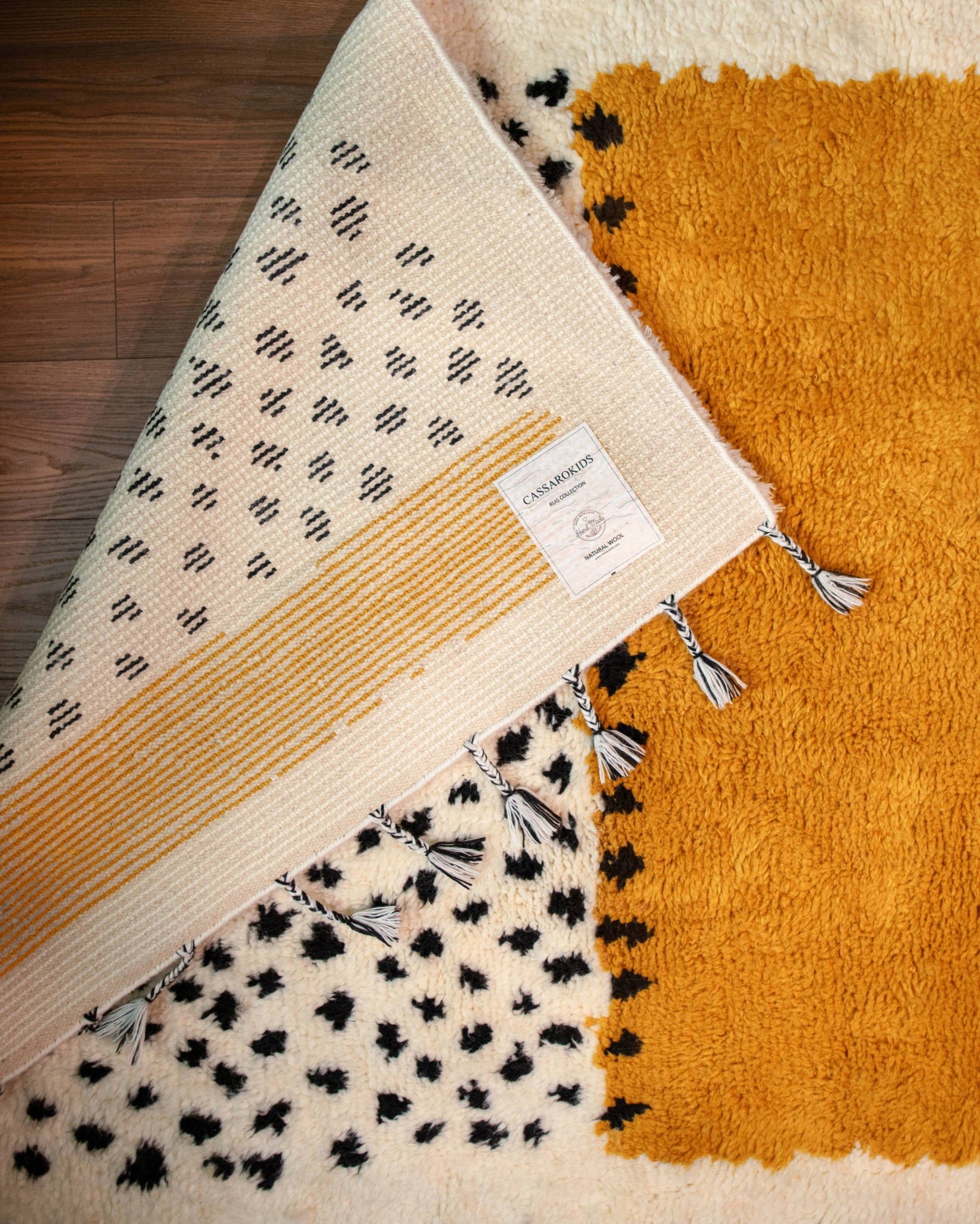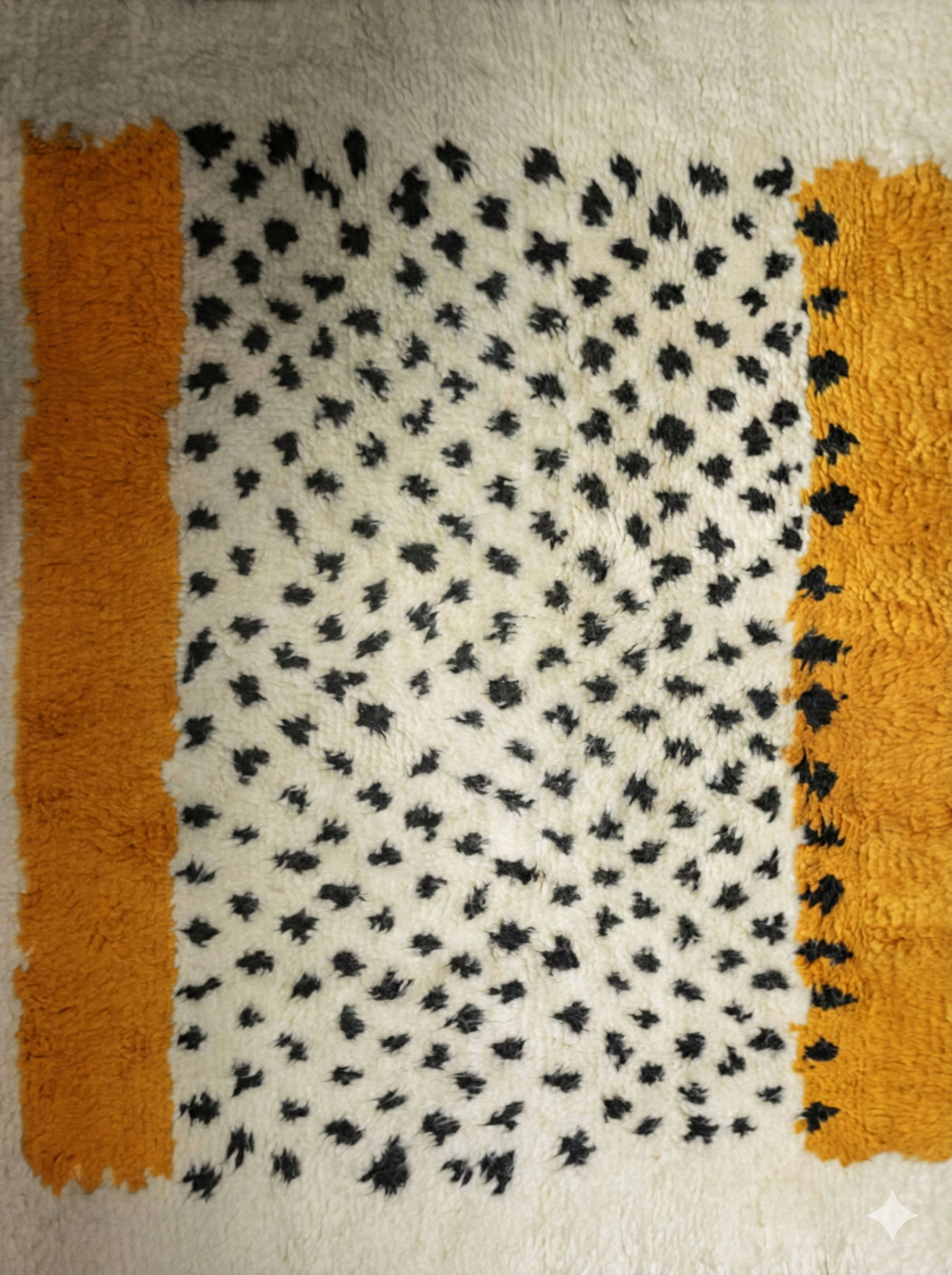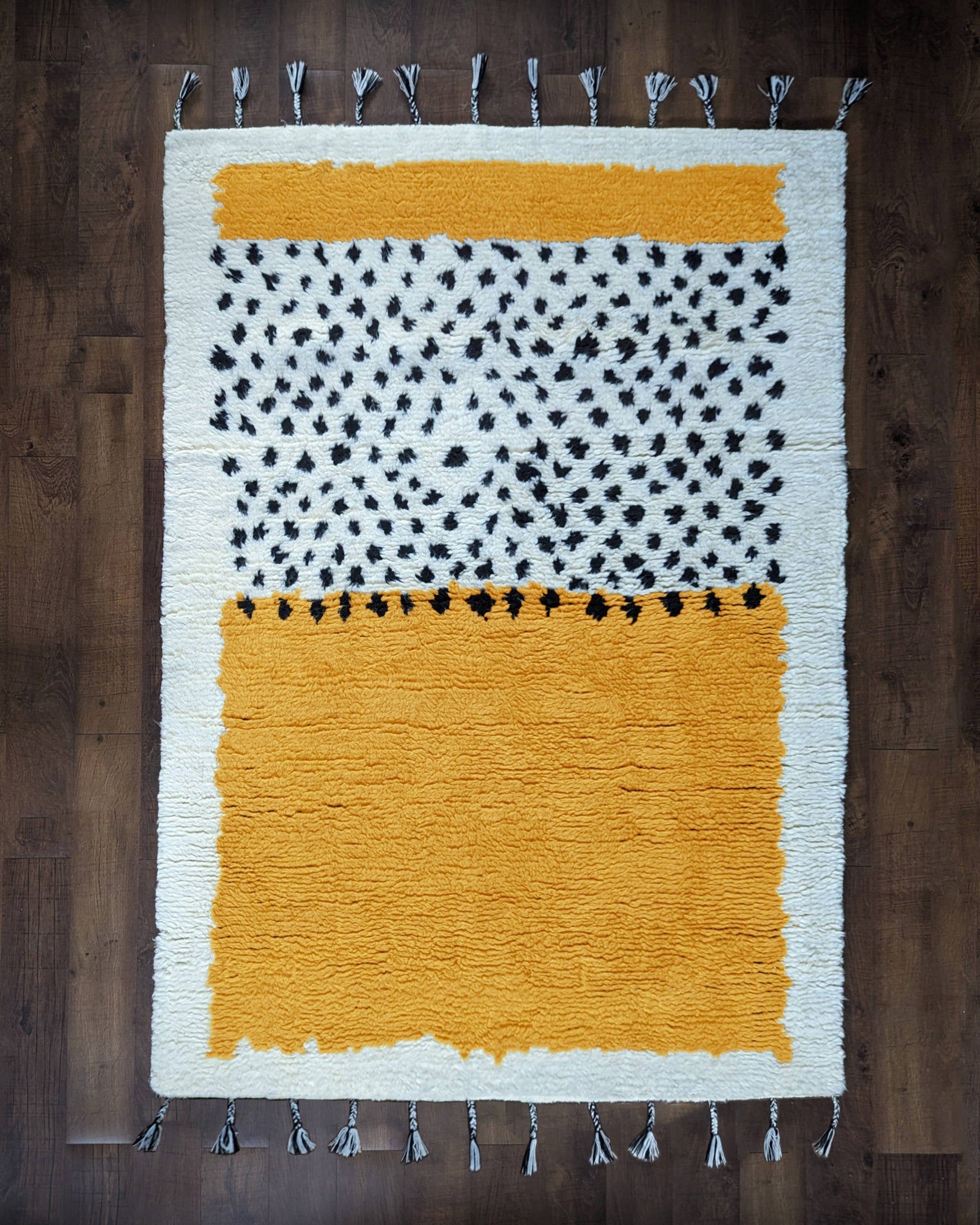 This isn’t just a rug; it’s the soul of the room. The ultra-thick wool texture invites you to lounge on the floor, making it a favorite spot for kids, pets, and adults alike. We love how the marigold section brings instant warmth to a space, while the unexpected mix of black and dalmatian-style spots adds a graphic, modern edge that keeps the look fresh.