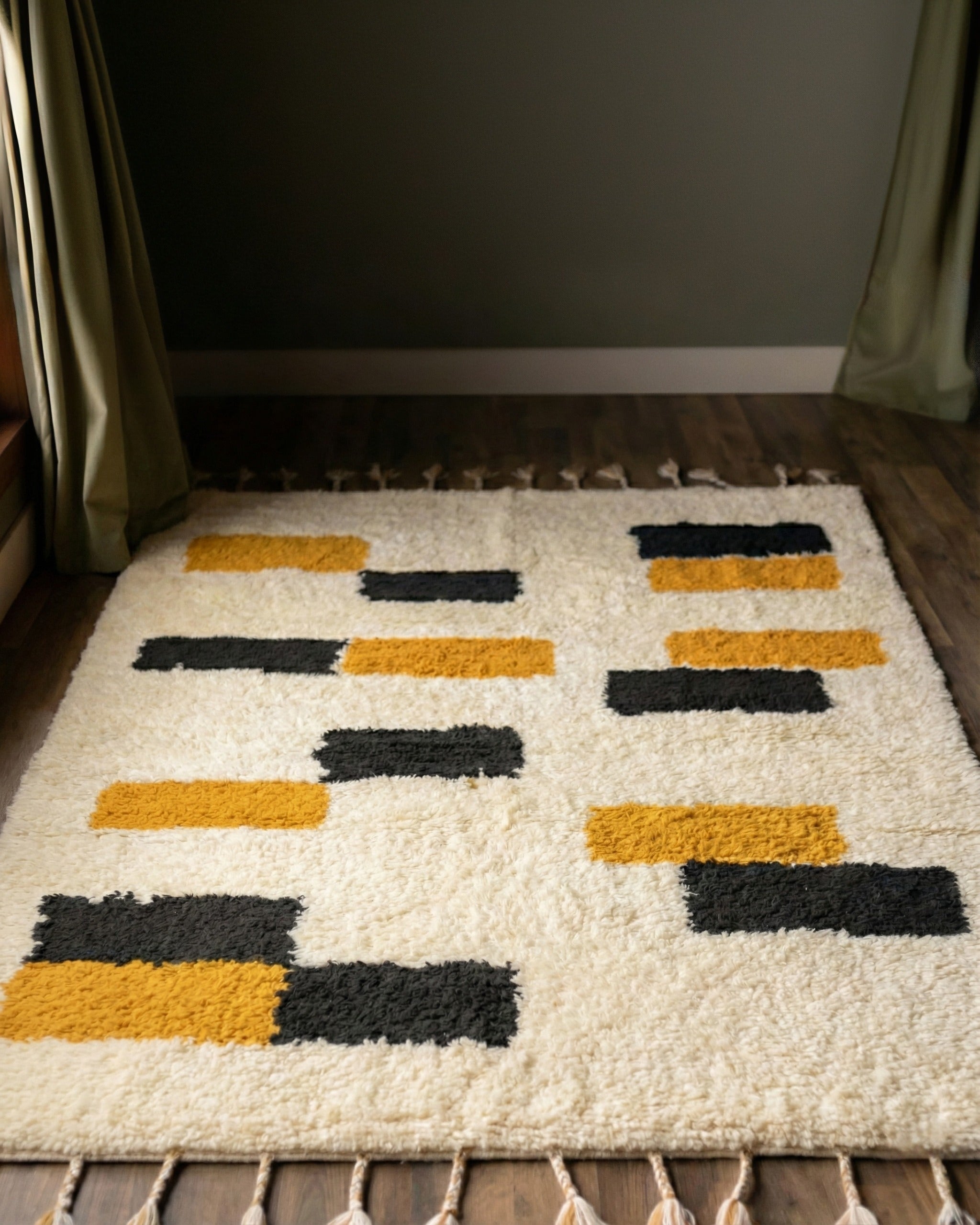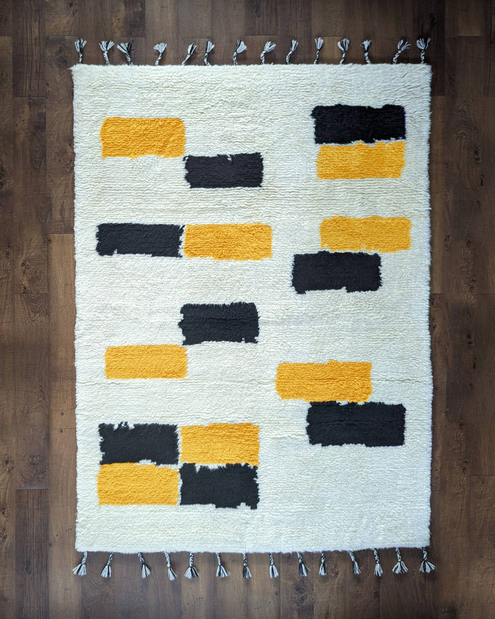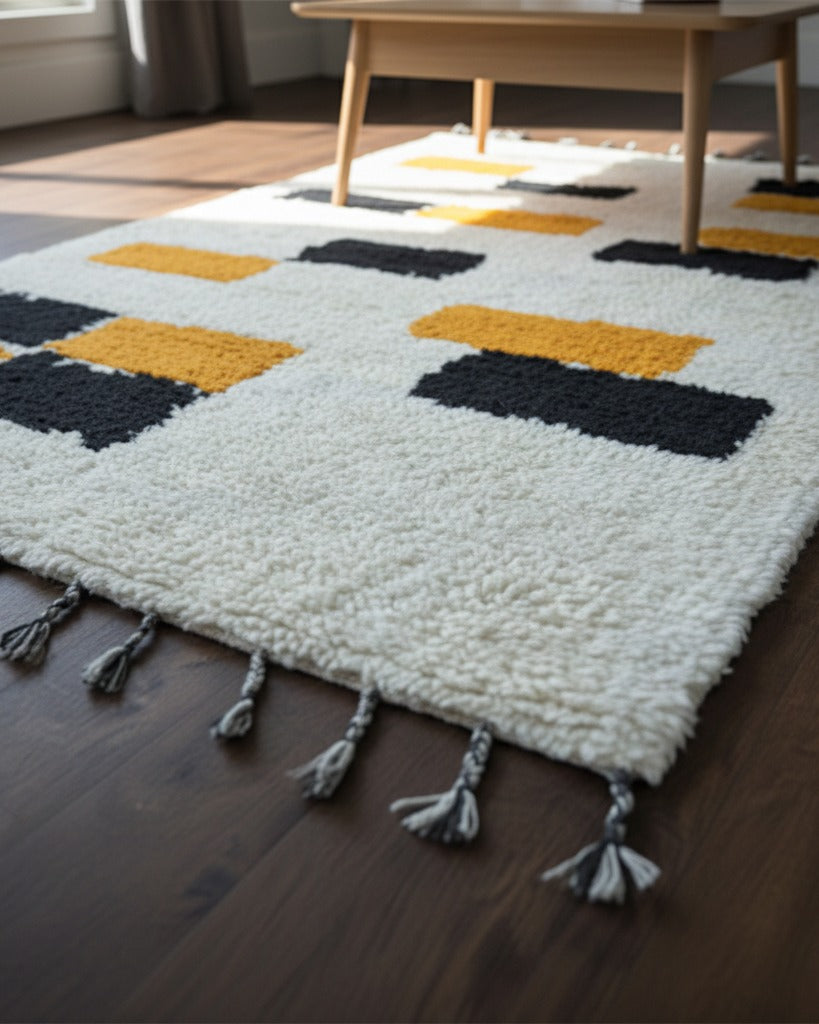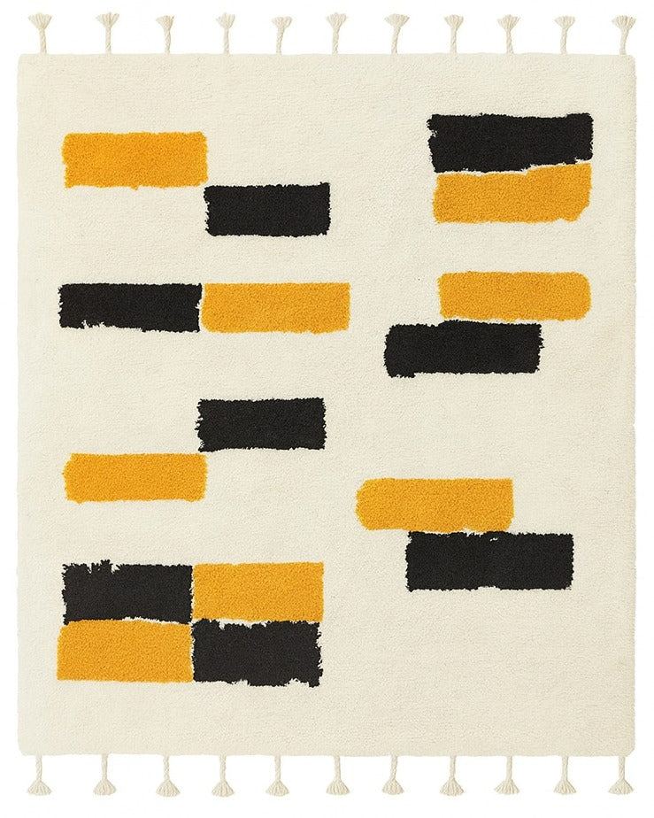The design features a sumptuously soft, creamy white canvas punctuated by an abstract arrangement of geometric blocks. The vibrant pops of mustard gold and deep charcoal create a sophisticated contrast that is bold without being overpowering. Finished with charming, hand-braided tassels on the edges, this piece brings an element of artisanal craftsmanship to any room.