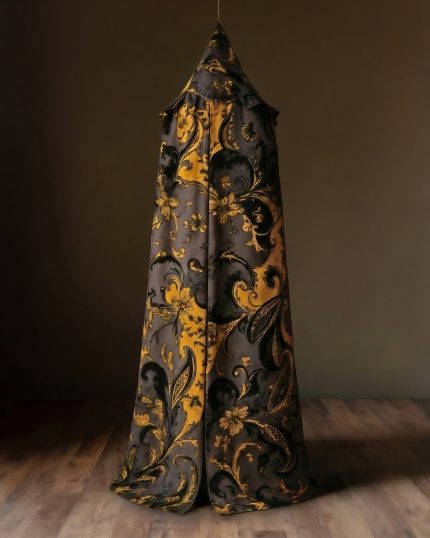 Elevate your living space with this exquisite velvet canopy, a masterpiece inspired by the opulent grandeur of Fabergé egg designs. Adorned with a lustrous golden print against a rich, deep velvet, this canopy exudes regal elegance & sophisticated charm. The intricate patterns, reminiscent of historical artistry, promise to transform any room into a sanctuary of luxury. Perfect for creating a dramatic focal point, a cozy reading nook, or adding a touch of imperial splendor to a bedroom. This canopy is more than just decor; it’s an heirloom in the making, inviting a sense of timeless beauty and grandeur into your home.