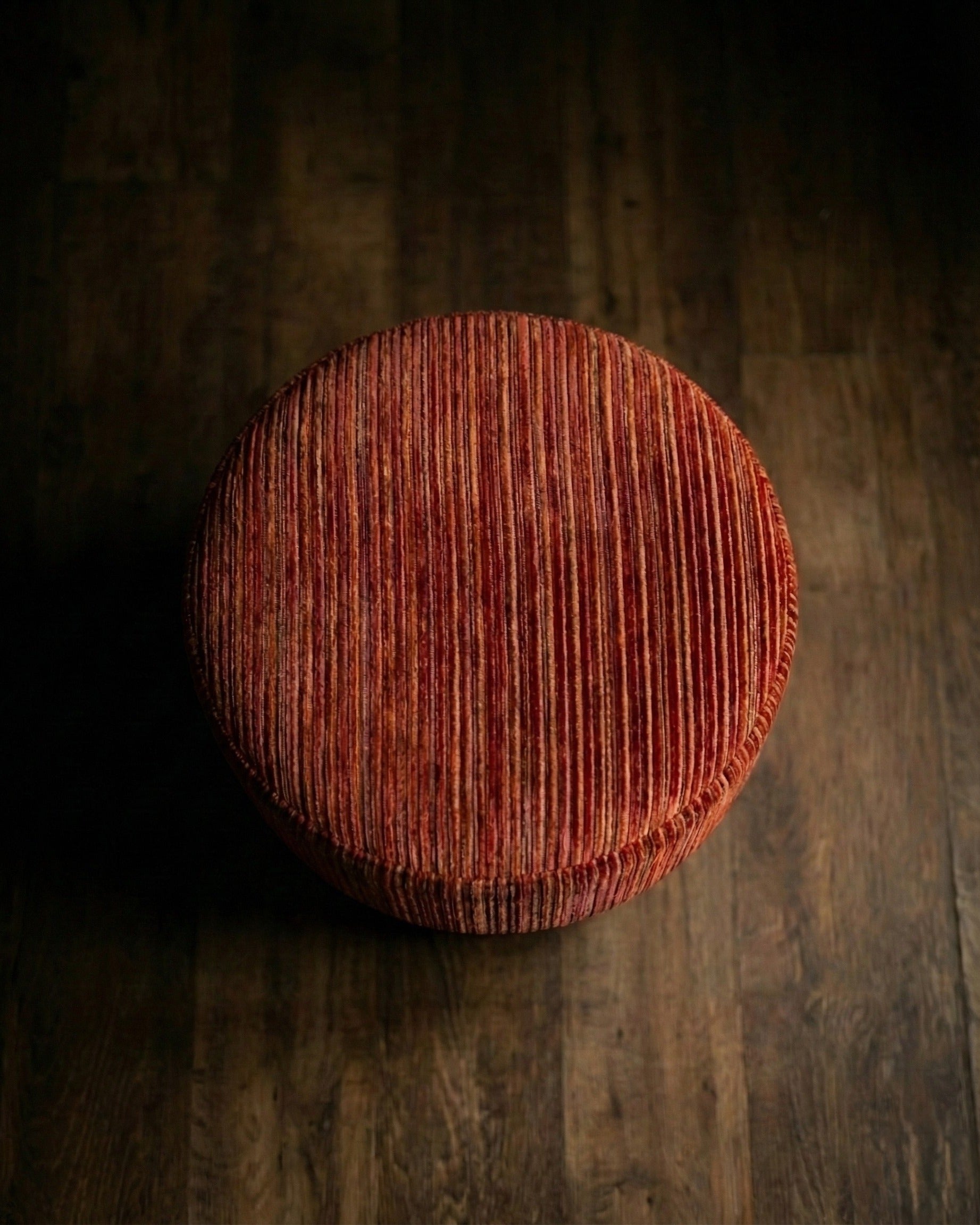 Featuring a plush, tactile cut-velvet texture, the striped pattern showcases a rich, warm palette of deep crimson, burnt gold, earthy browns, and muted olive. The fabric catches the light beautifully, adding depth & sophistication to any room.