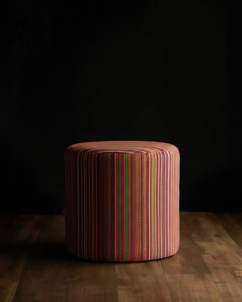 Infuse your living space with the timeless elegance of old-world craftsmanship. This striking cylindrical ottoman is upholstered in authentic Belgian fabric, renowned worldwide for its superior quality and intricate weaving techniques.