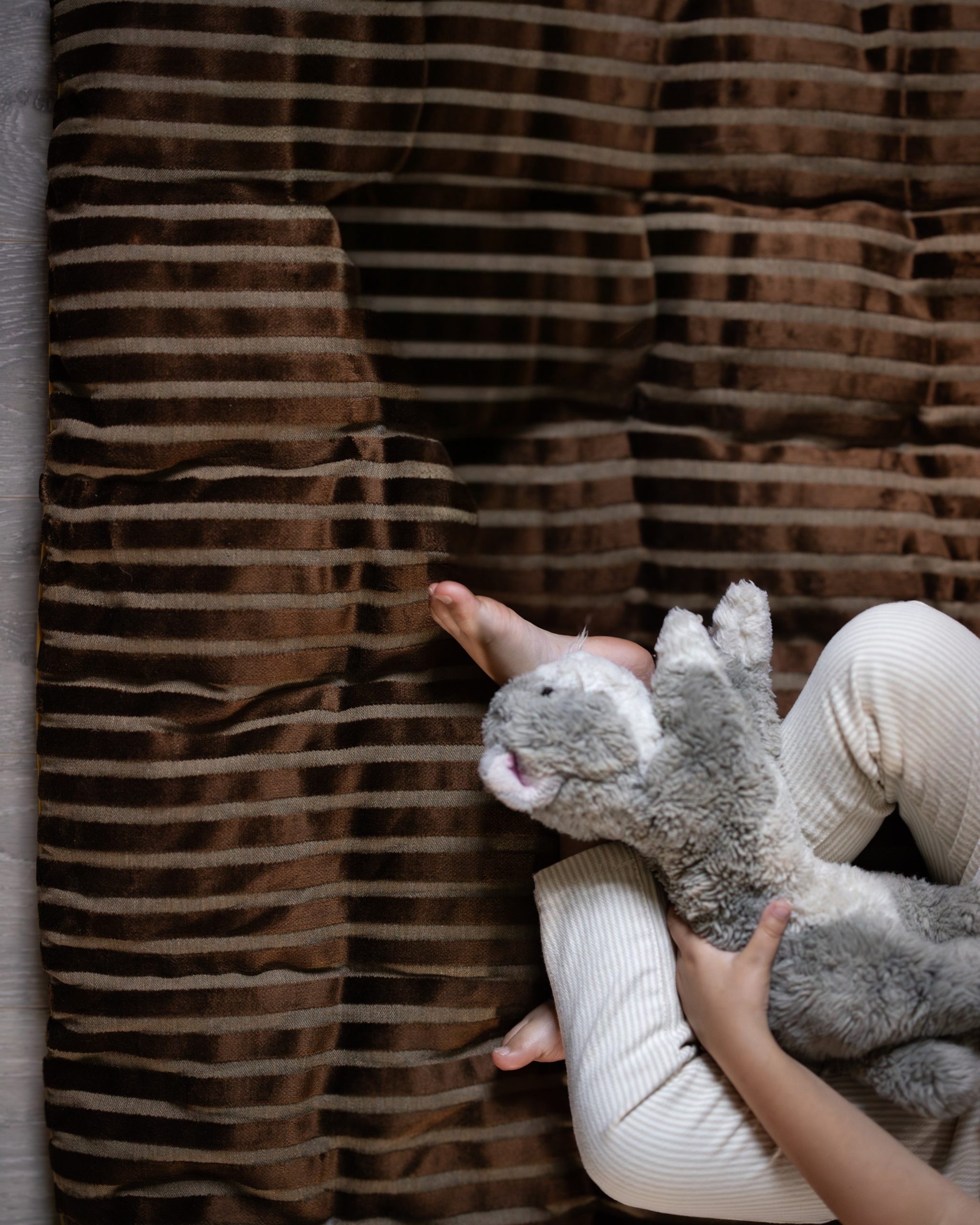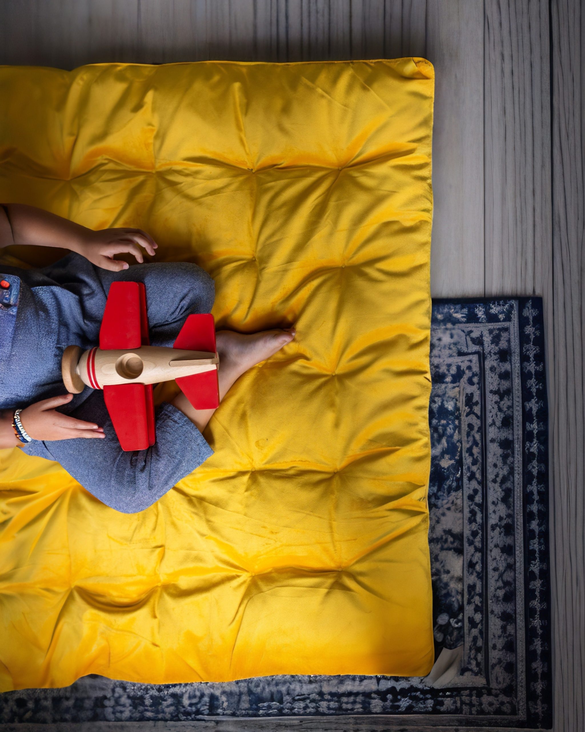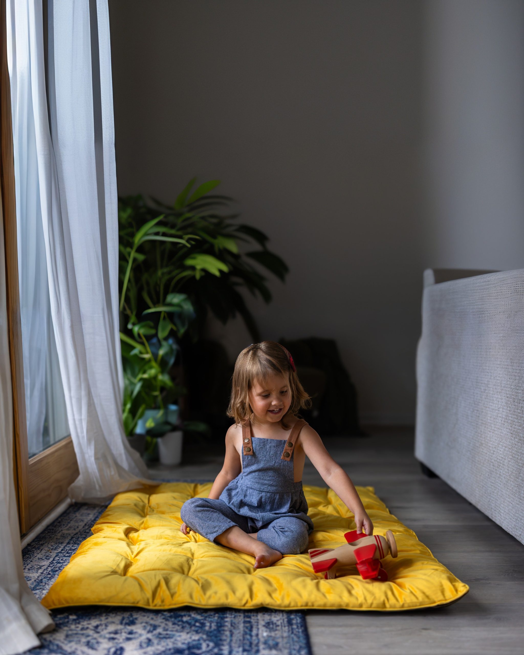 This pillow is massive, durable, and incredibly soft. The tufted construction keeps the stuffing neatly in place, even during pillow forts or storytime marathons. We love the reversible design—featuring a bright pop of color on one side and a calmer tone on the other—letting you match the energy of the room in seconds. It’s the perfect spot for kids to play and adults to relax.