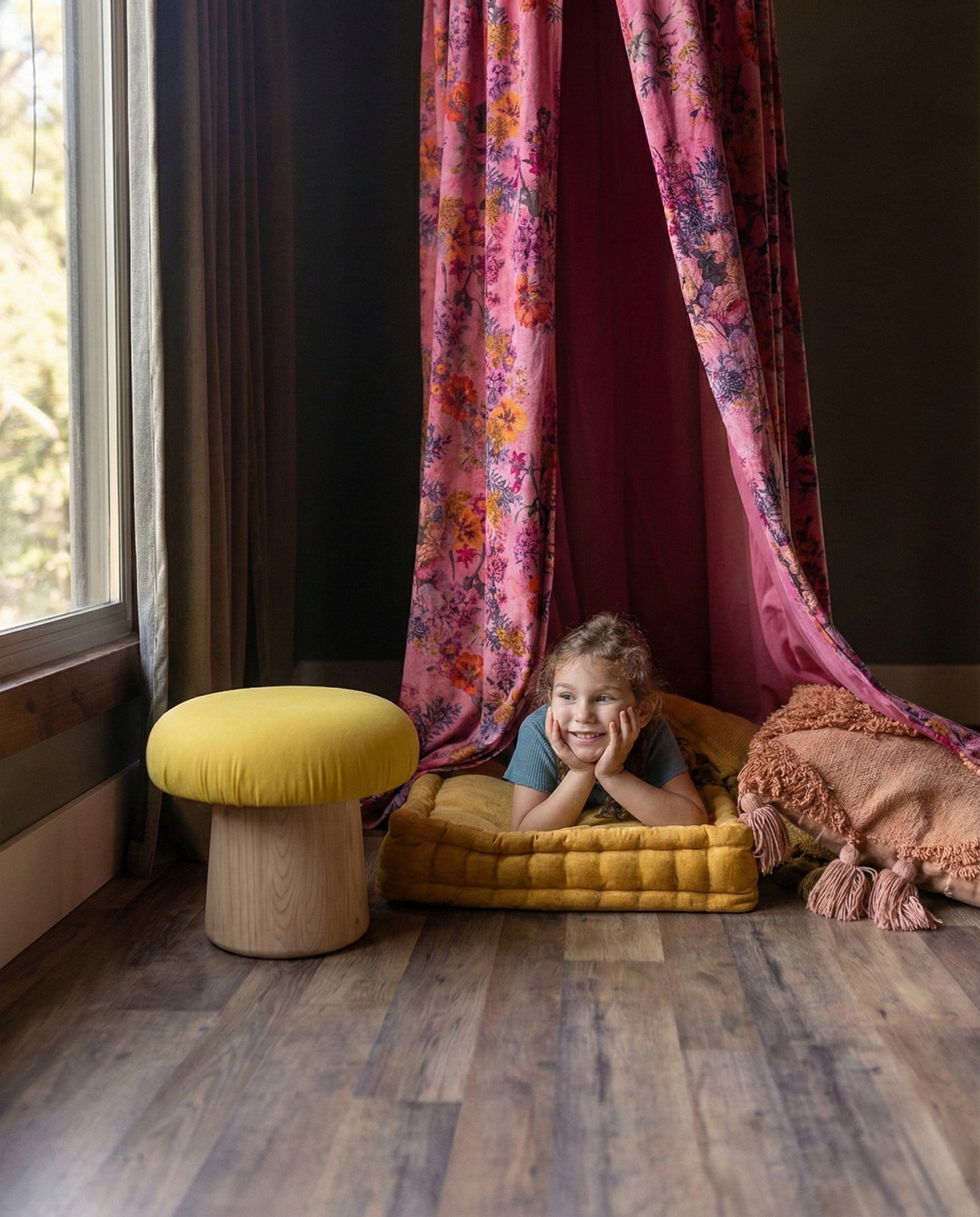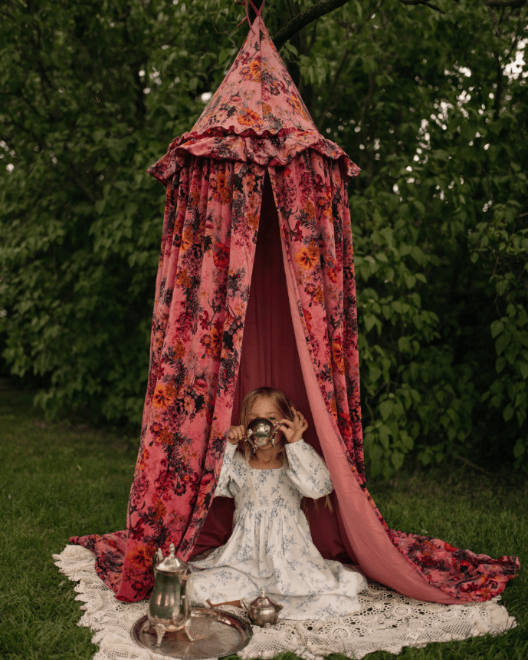 Every child needs a magical hideaway to call their own. Transform any corner of the nursery or playroom into an enchanting escape with this lush, pink floral canopy. Crafted from soft, rich velvet that feels as cozy as it looks, this hanging tent features a vibrant riot of vintage-inspired blooms in shades of deep orange, purple, and gold.