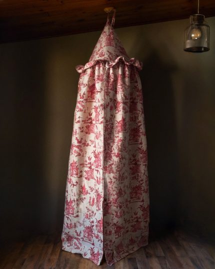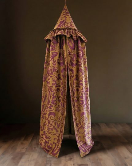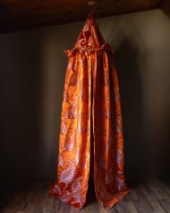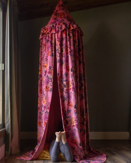 The Helene canopy features a vibrant orange hue, adorned with a delicate, intricate paisley pattern in a soft, contrasting shade. This timeless design brings a touch of sophisticated whimsy, perfectly complementing a high-end children’s interior. Whether it’s a quiet nook for reading and dreaming, a secret hideaway for imaginative play, or a stylish focal point in a curated playroom, the Helene canopy invites endless possibilities.