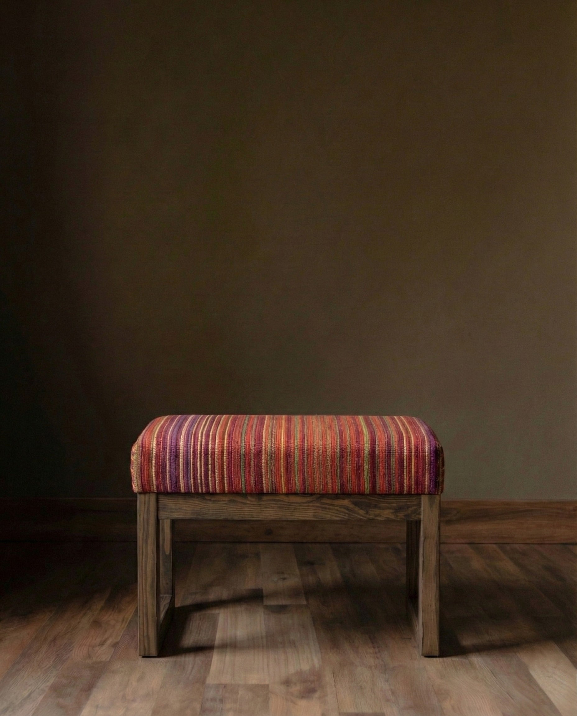Ground your space with the perfect blend of rugged strength and vibrant comfort. This substantial bench is handcrafted from solid timber, stained in a deep, dark walnut finish that highlights the wood’s natural grain and sturdy character. Built to last for generations, the robust frame is topped with a thick, plush seat cushion. The upholstery is a high-end, richly textured woven fabric with a velvet-soft hand, featuring a warm palette of sunset stripes—deep reds, rust oranges, and muted purples. It’s an inviting statement piece designed to bring warmth and artisanal quality to your entryway, dining table, or the foot of your bed.