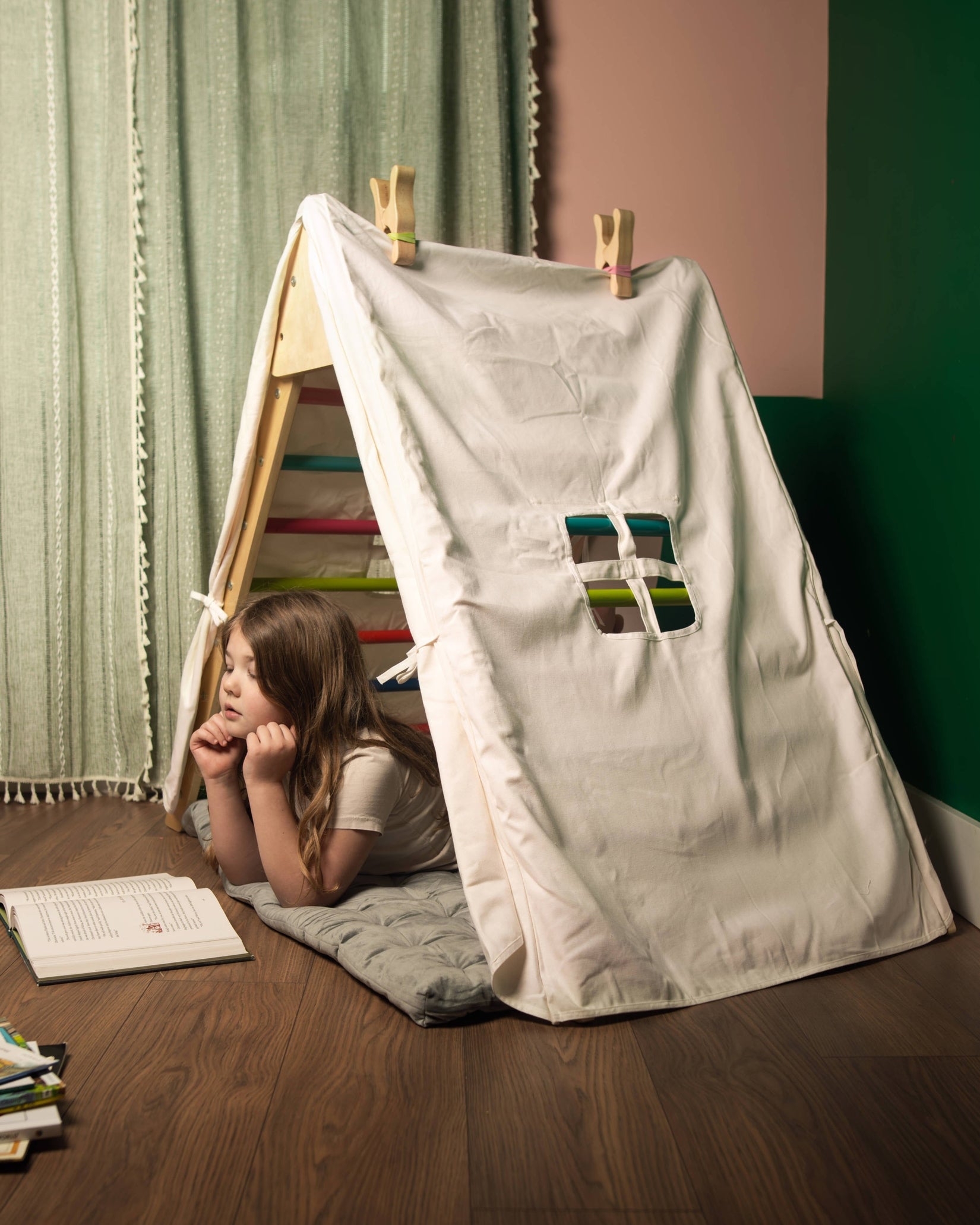 Place children in a world of imagination with this play tent! Perfect for a playroom or living room, it covers your existing Pikler Triangle and provides a space for kids to enjoy their favorite toys and stuffed animals or create their own cozy haven of blankets and pillows. Inspire little dreamers to use their imaginations and visit far-off lands, all from the comfort of home!