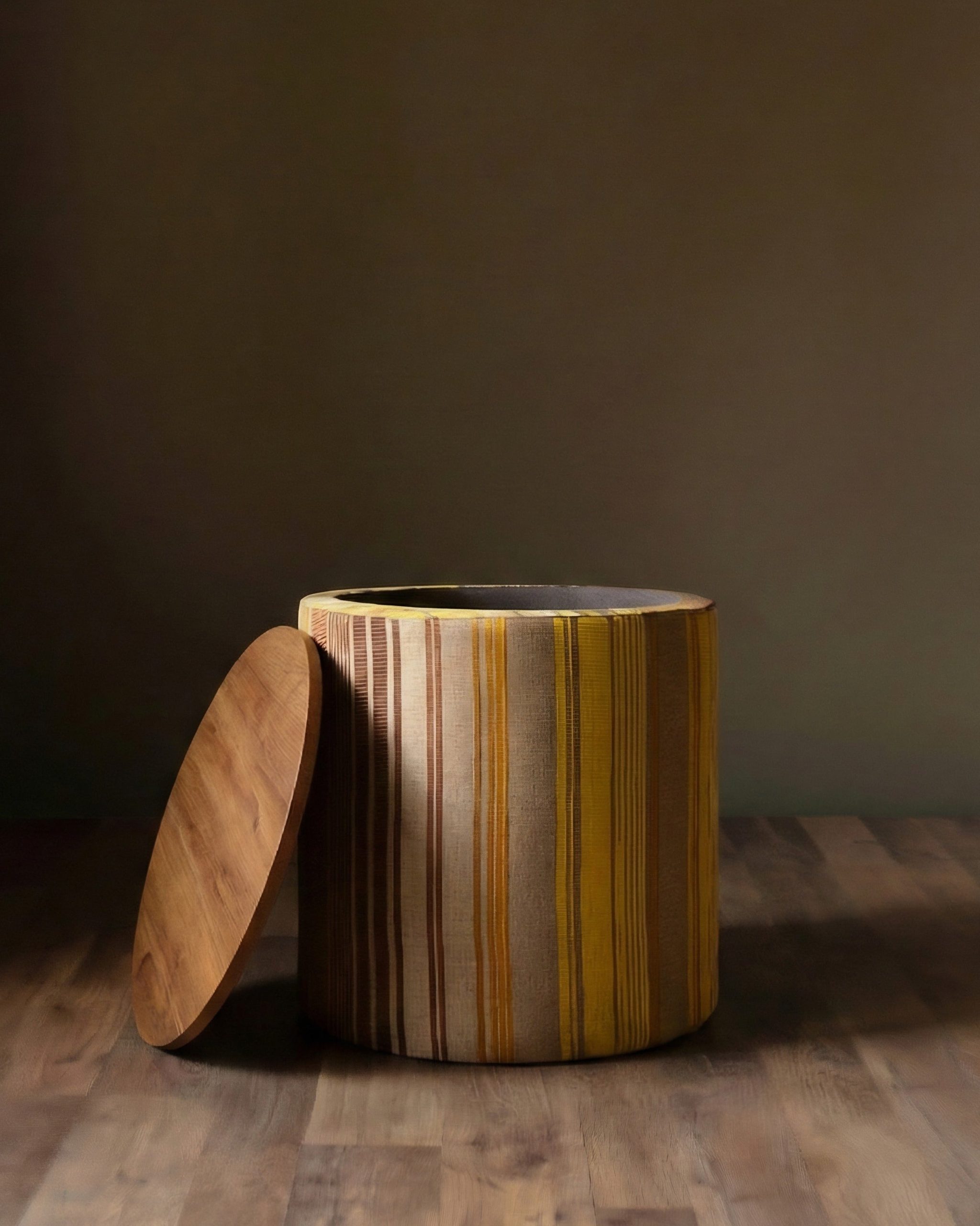 The Laurent Storage Ottoman seamlessly blends refined aesthetics with practical storage. Wrapped in sumptuous velvet with striking stripe detailing inspired by Moroccan design, this drum-shaped piece adds understated elegance to any room. The sturdy wood top functions as a convenient side table for beverages, books, or décor, while the spacious lined interior conceals blankets, toys, and household essentials. Whether anchoring a living room, nursery, or reading corner, the Laurent delivers both visual sophistication and everyday functionality—a thoughtfully designed piece that earns its place in a well-appointed home.