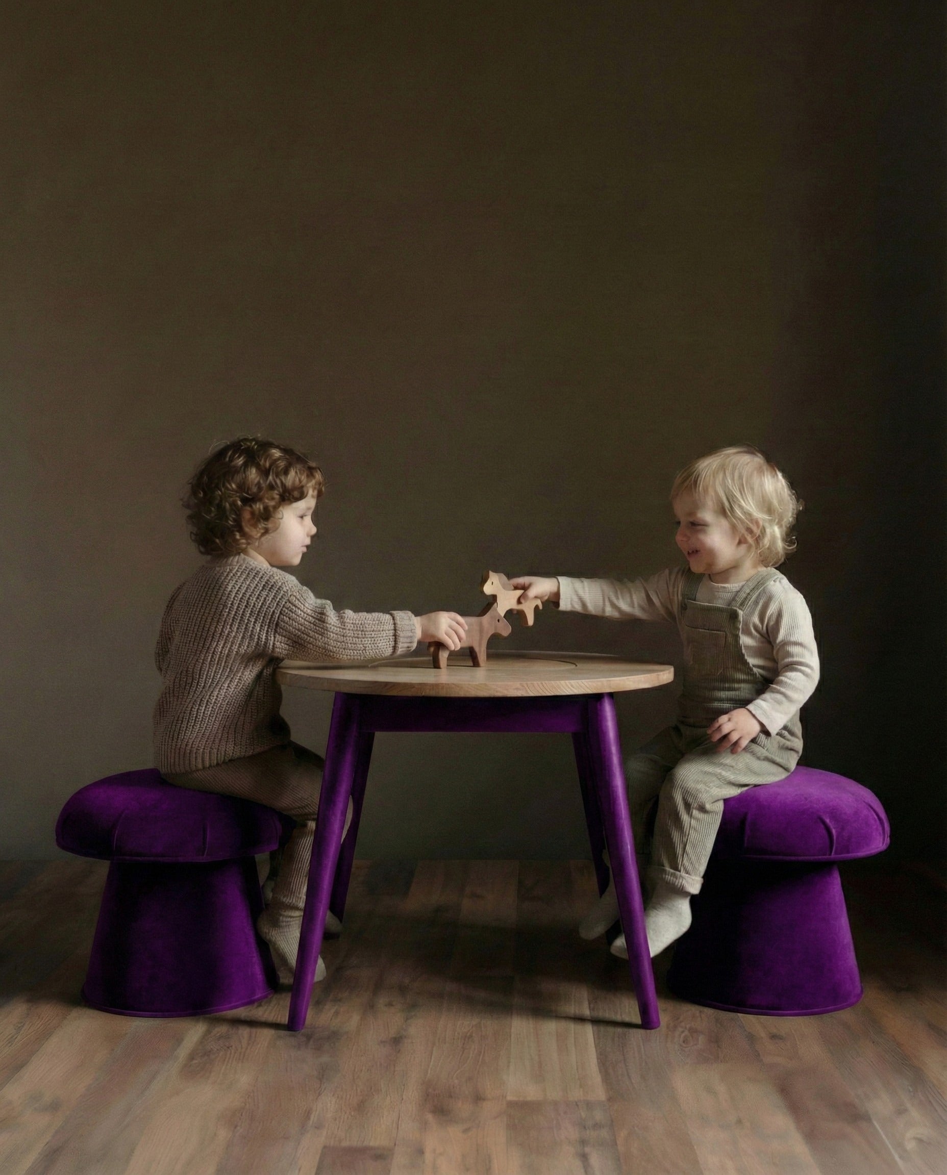The Lucille play table and mushroom stool set is thoughtfully designed to elevate playtime while keeping toys and essentials neatly organized. Featuring plush velvet-covered stools, this elegant set is crafted from solid oak wood, ensuring both durability and safety. Available in a refined palette of marigold, purple, forest green, black, and natural hues, it allows you to create a peaceful retreat tailored to your child’s favorite color, ideal for both relaxation and imaginative play.
